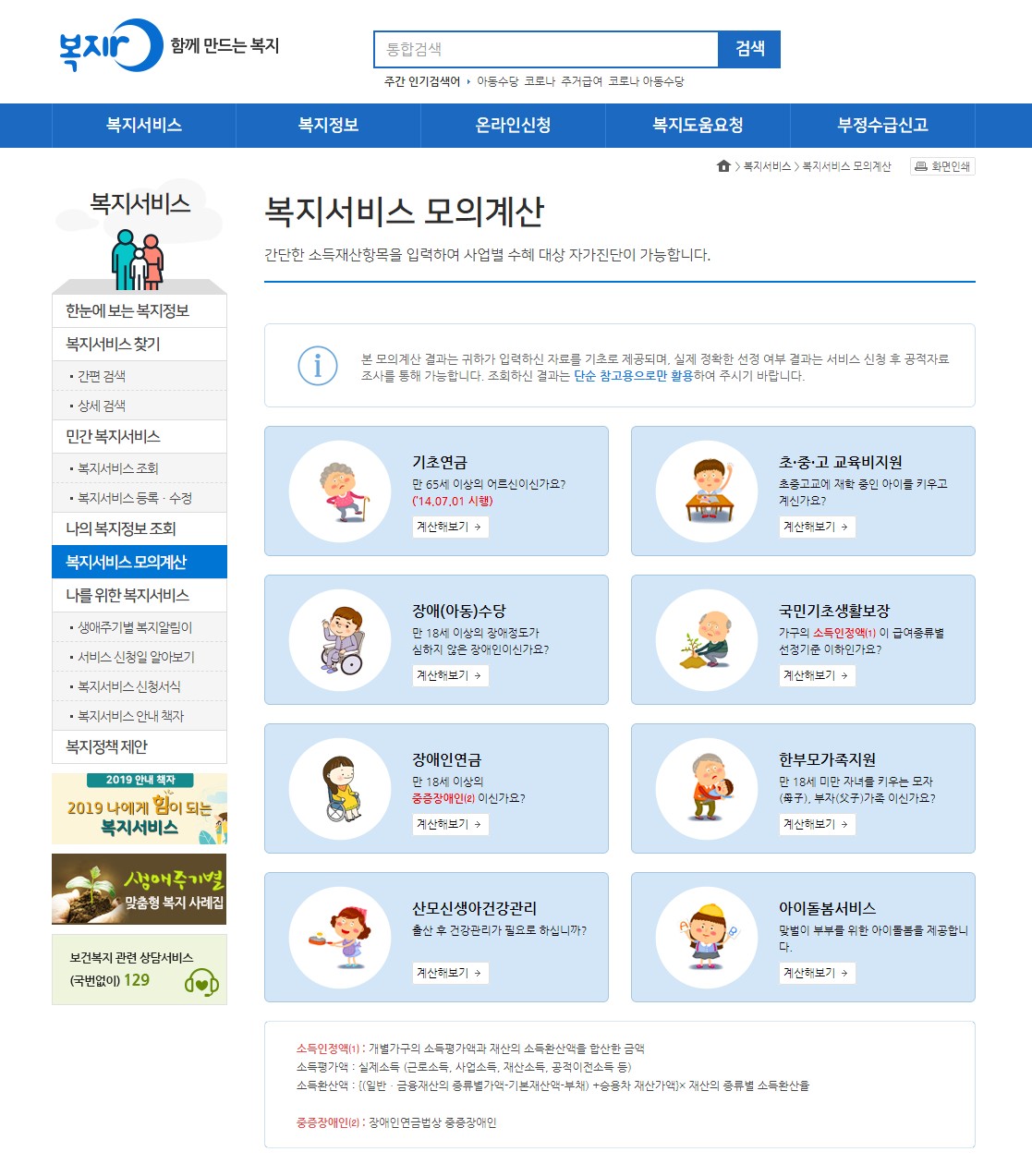 그 외의 분들은 복지로사이트의 복지서비스 모의계산 항목에서 소득인정액을 스스로 계산하여야 한다.