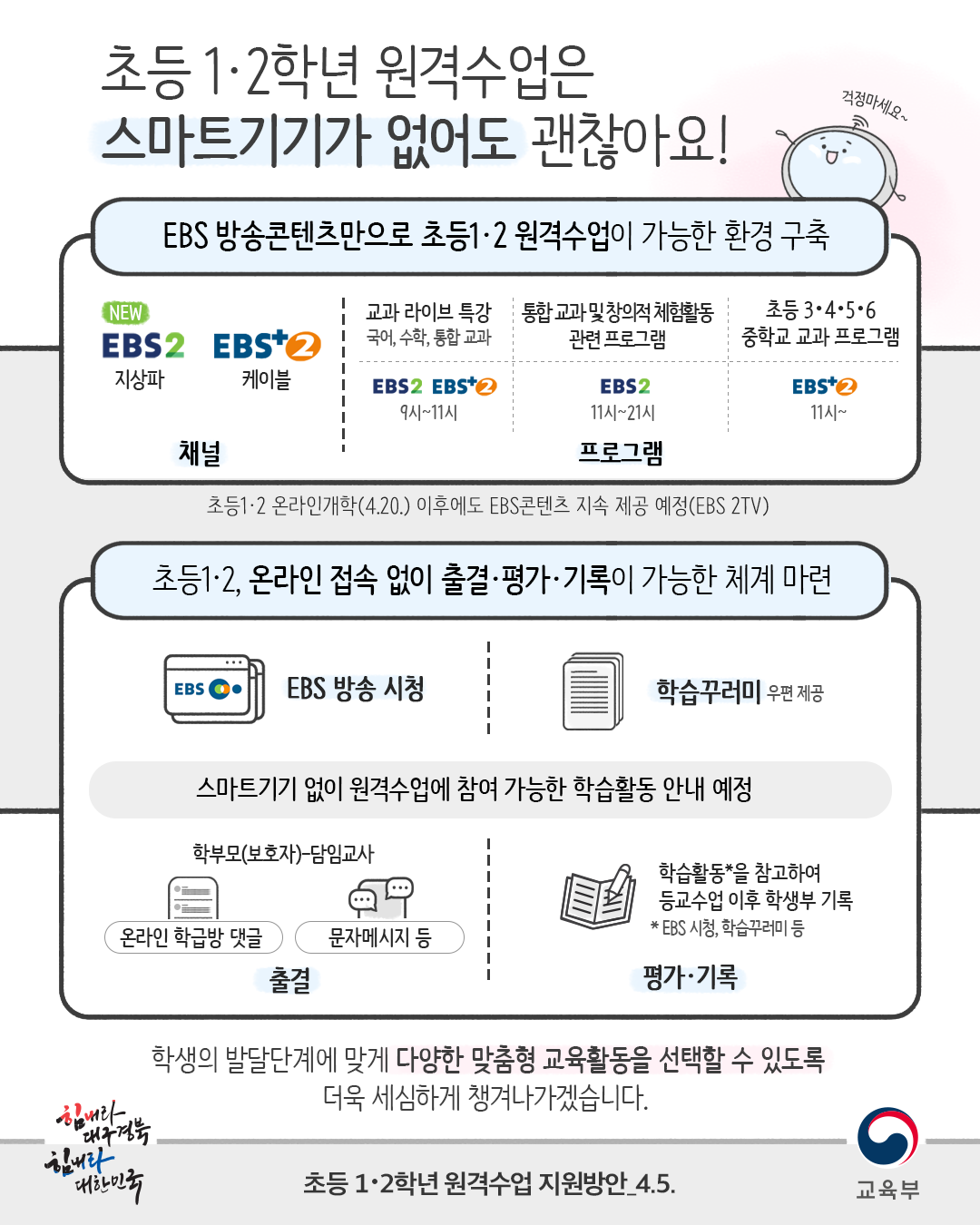 다음으로, 교육부는 초등학교 1, 2학년 학생들의 원격수업 기간(4월 20일(월)~)에 TV를 활용하여 EBS 방송 시청 및 학습꾸러미를 활용한 학습활동으로 출석 확인, 평가, 기록 등의 학생 관리가 이루어질 수 있도록 시도교육청에 안내(4월 8일(수) 예정)한다. 학생의 출석은 학부모(보호자)와 담임교사 간 학급방 댓글, 문자메세지 등으로 확인할 수 있도록 하고, 평가와 기록도 온라인 접속이 아닌 EBS 방송 시청 및 제공된 학습꾸러미* 등을 활용한 교육 활동에 대해 등교수업 이후 담임교사가 학생부에 기록할 수 있게 한다.