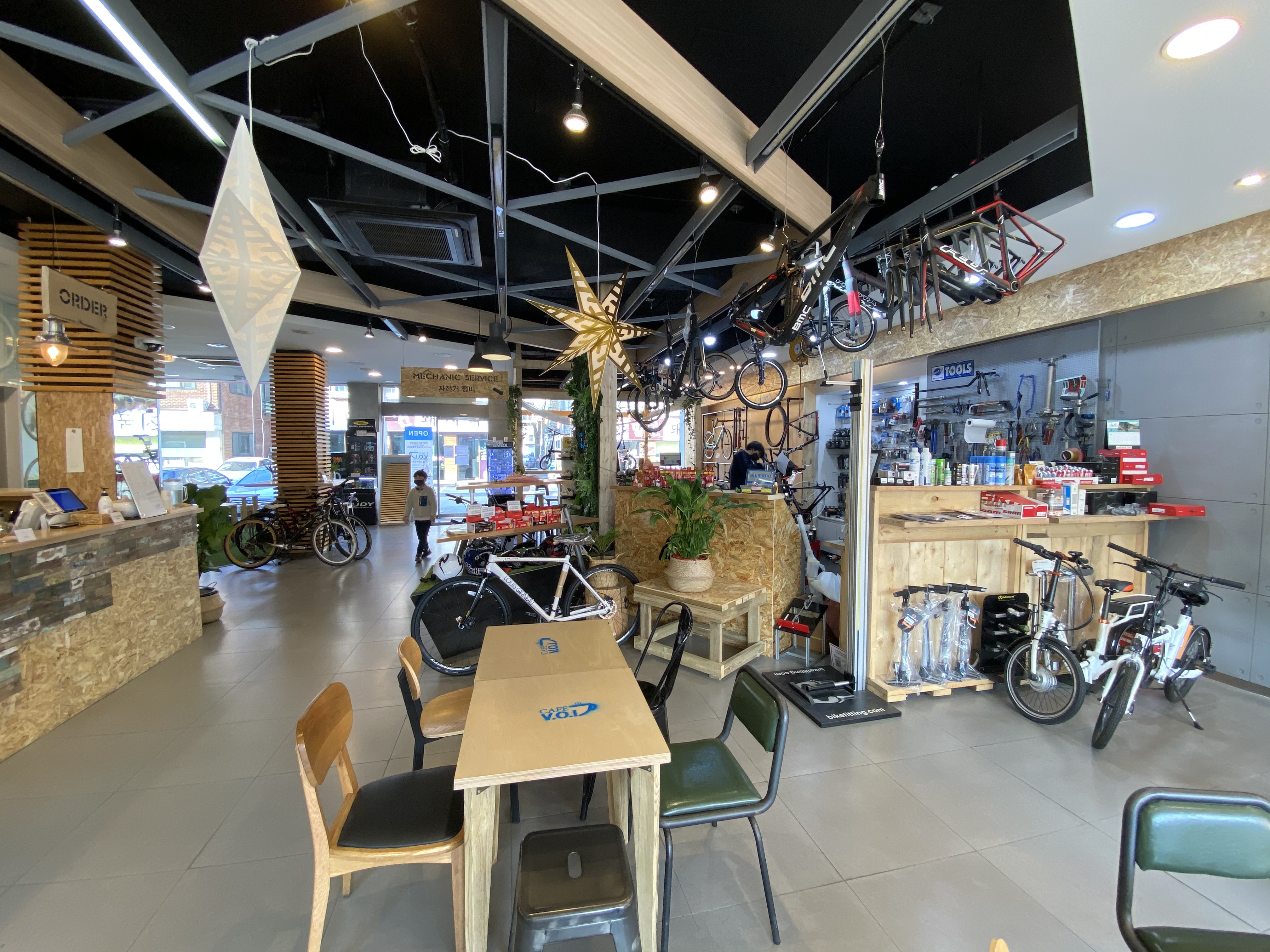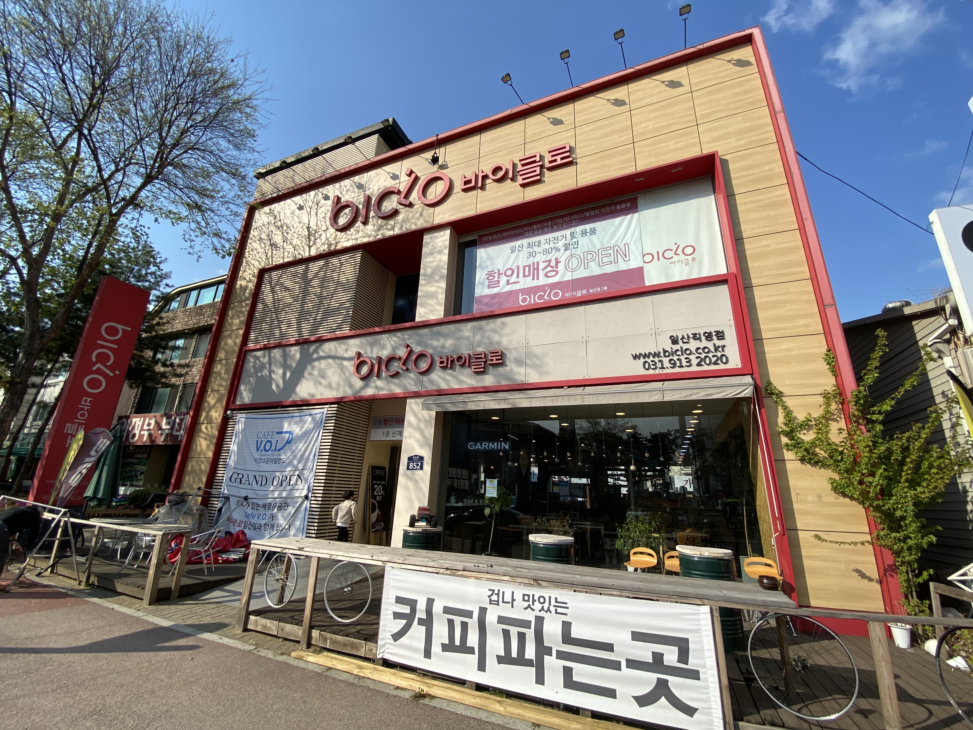 킨텍스 현대백화점을 지나, 킨텍스 맞은편 대로에 자리잡고 있다. (뒷편으로 가면 3~4대는 주차할 수 있는 공간이 있다.) 건물 하나를 통째로 쓰고 있고, 1층은 카페 겸 수리를 하는 장소로, 2층은 자전거 및 부품, 의상을 판매하는 곳으로 사용하고 있다. 1~2층에 직원은 사장님 한분 밖에 안계셨다.