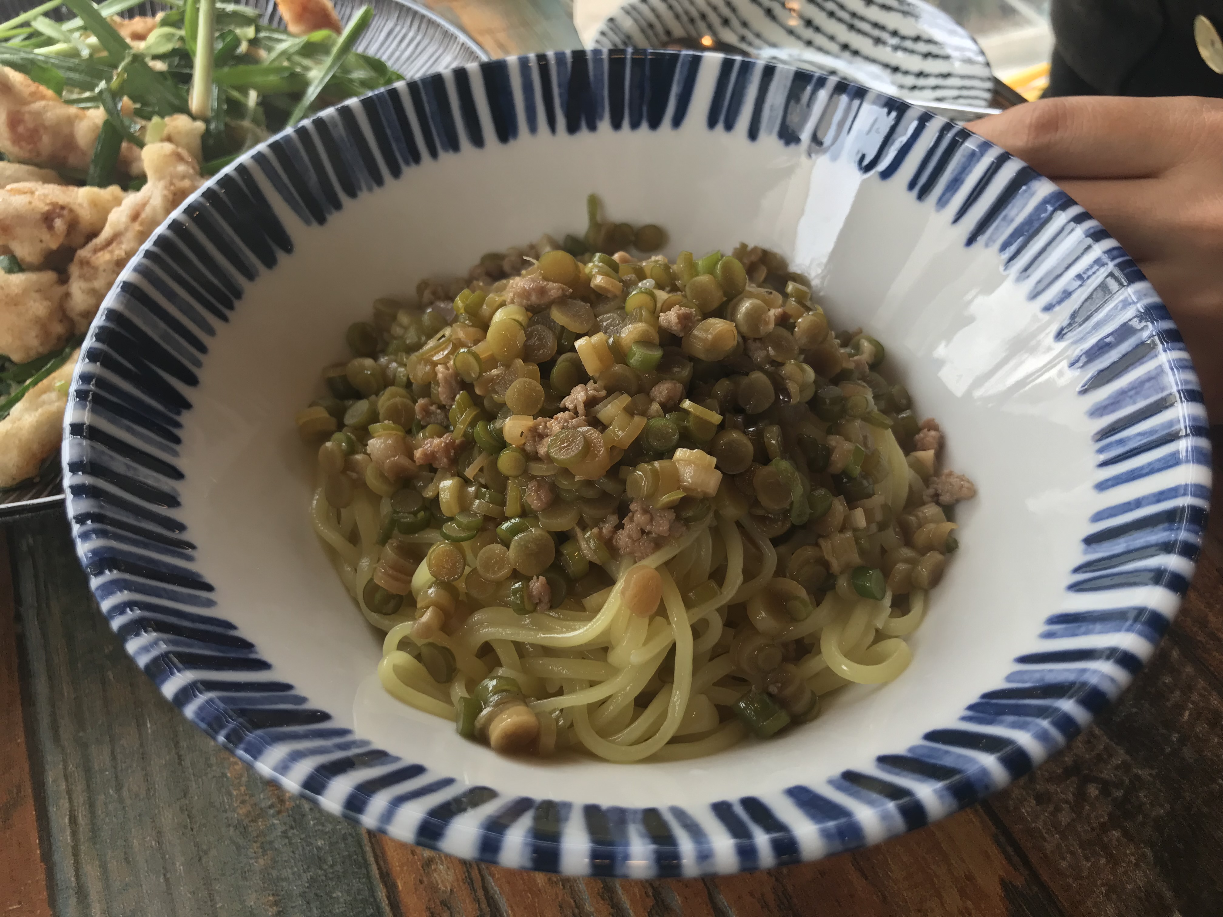 시그니처 메뉴인 마늘쫑면이다. 마늘쫑을 잘게 썰어, 다진고기와 면을 함께 낸 음식이다. 별것없어 보이는데 술술 들어간다. 마늘쫑의 달짝지근한 맛과 간간한 고기의 맛이 조화롭기 그지 없다. 앞으로 몇 번을 더 갈지 모르겠지만 갈 때 마다 주문할 것 같다.