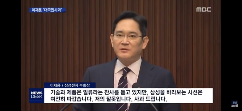 오늘의 삼성은 '글로벌 일류기업'으로 성장했습니다. 국민의 사랑과 관심이 있었기 때문에 가능한 일이었습니다. 하지만 그 과정에서 때로는 국민의 기대에 부응하지 못했습니다. 오히려 실망을 안겨드리고 심려를 끼쳐 드리기도 했습니다. 법과 윤리를 엄격하게 준수하지 못했기 때문입니다. 사회와 소통하고 공감하는 데에도 부족함이 있었습니다. 기술과 제품은 일류라는 찬사를 듣고 있지만 삼성을 바라보는 시선은 여전히 따갑습니다. 이 모든 것은 저희들의 부족함 때문입니다. 저의 잘못입니다. 사과 드립니다.