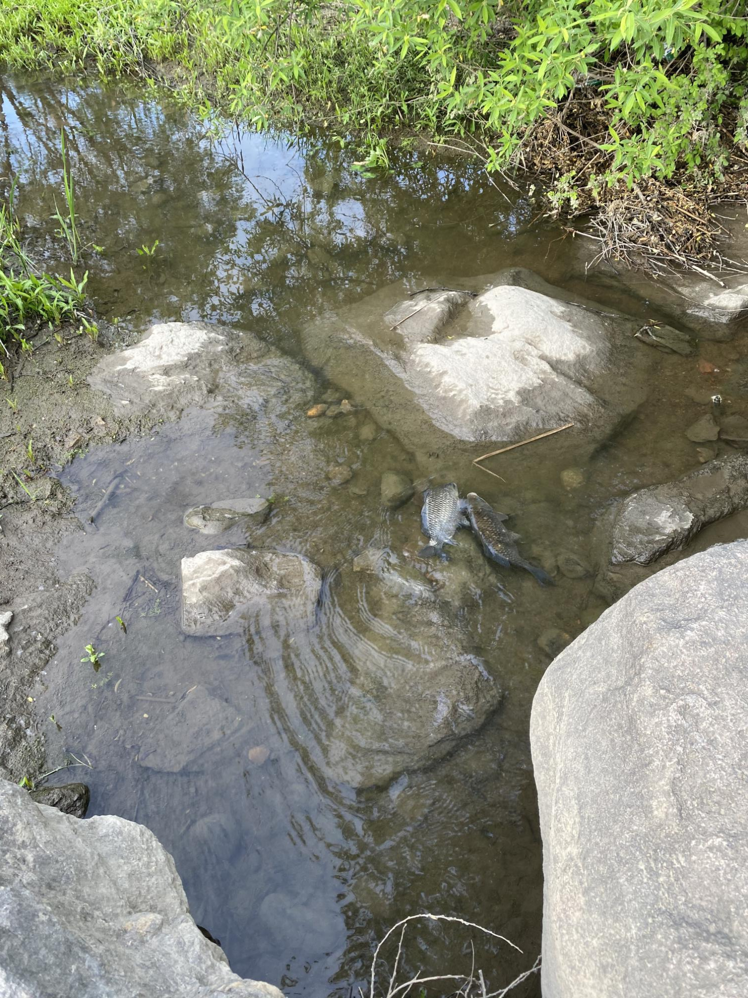 돌 다리 주변에서 만난 잉어 커플. 주검으로 둥둥 떠 있는 줄 알았으나 활기차게 수영해서 물 속으로 나아갔다.
