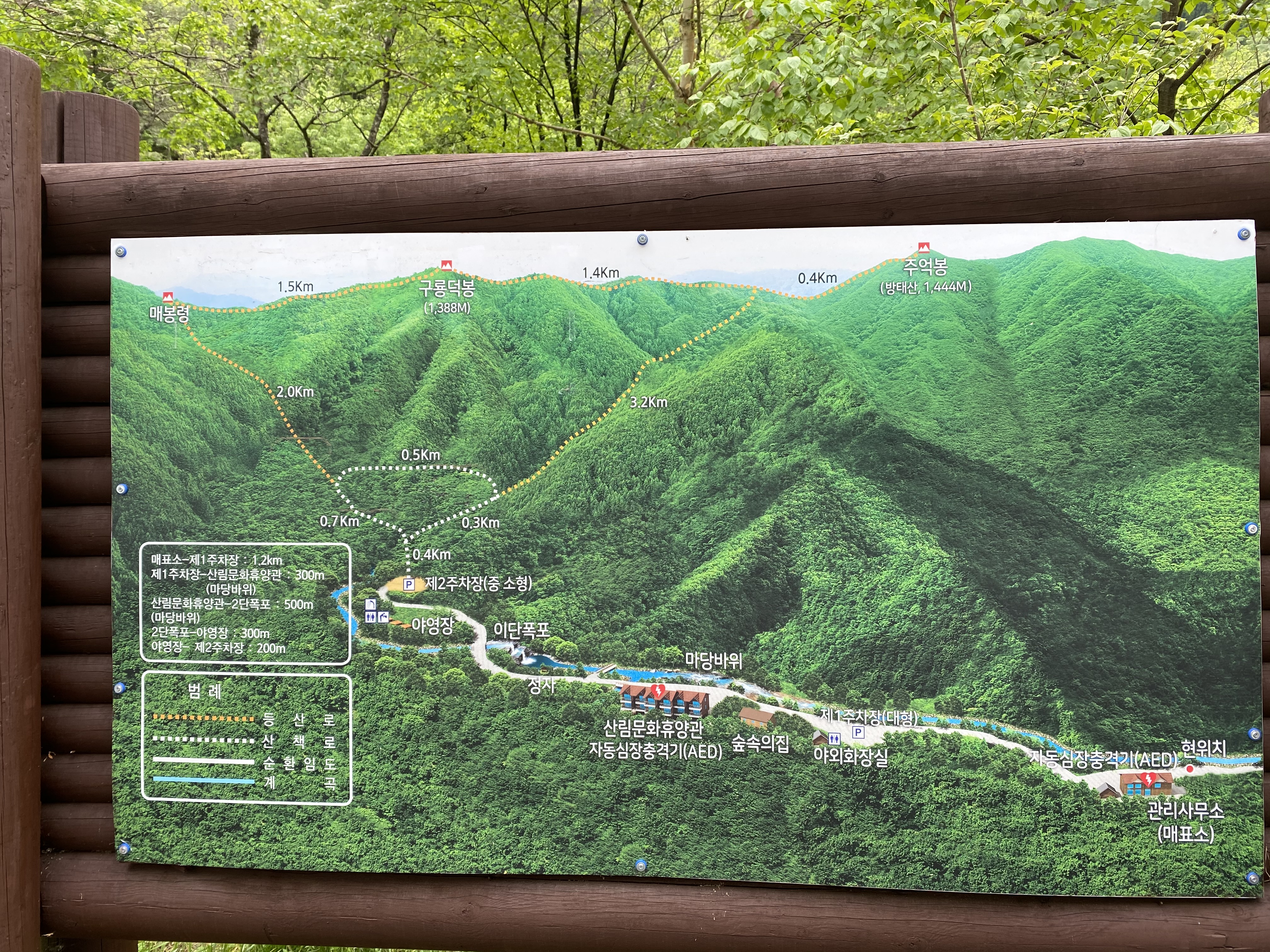 자연휴양림 입구에서 주차비와 입장권 비용을 지불한다. 주차비는 경차 1,500원, 소형 3,000원 / / 어른 입장료는 1,000원, 청소년 600원, 어린이 300원이다. 입구를 지나고 주차장까지 좀 더 올라가야 한다. 자연휴양림 휴양관을 지나고 좀 더 올라가야 주차장이 나온다. 주차장에 차를 주차하고 등산을 시작하면 된다. 주차 공간이 넉넉하지는 않아서 길가에 주차한 차들이 많이 보인다. (안내도의 제2주차장에 주차를 하고 올라가면 된다)