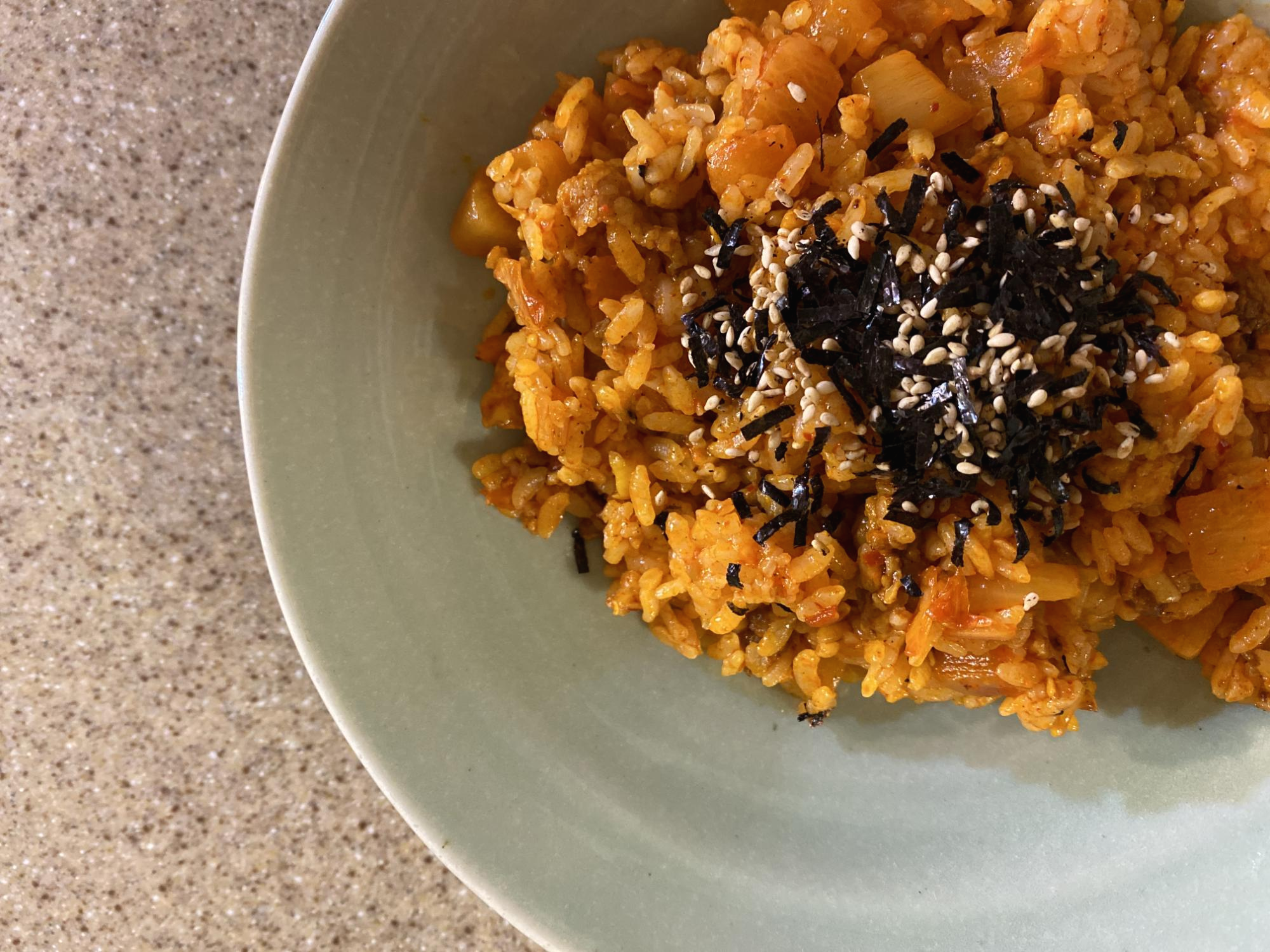꽁꽁 얼어있는 볶음밥을 기름을 두르고 볶는다. 얼마지나지 않아 녹으면서 시뻘건 비주얼이 모습을 드러낸다. 깍두기와 고기의 함량이 제법 많아 보였다. 조리된 것을 냉동한 것이라 완성까지 시간이 오래 걸리지는 않는다. 마지막에 참깨와 김고명을 뿌려주면 제법 그럴싸한 요리가 완성된다.