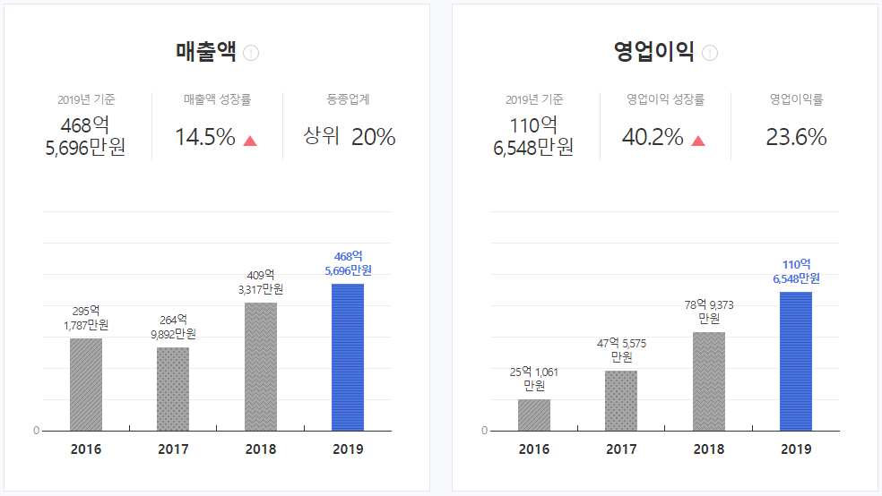 매출액 성장률도 좋고, 영업이익 수치도 높고 (계속 성장하고 있고) 간단한 재무 현황으로는 괜찮아 보인다.