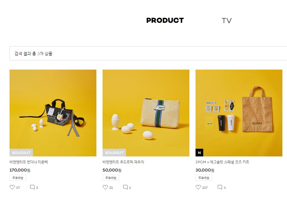 네이버에서 에그슬럿을 검색하면 최상단에 쇼핑몰 29CM가 노출된다. 들어가 보면 아래와 같이 굿즈들이 노출되는데 이미 품절완료이다.