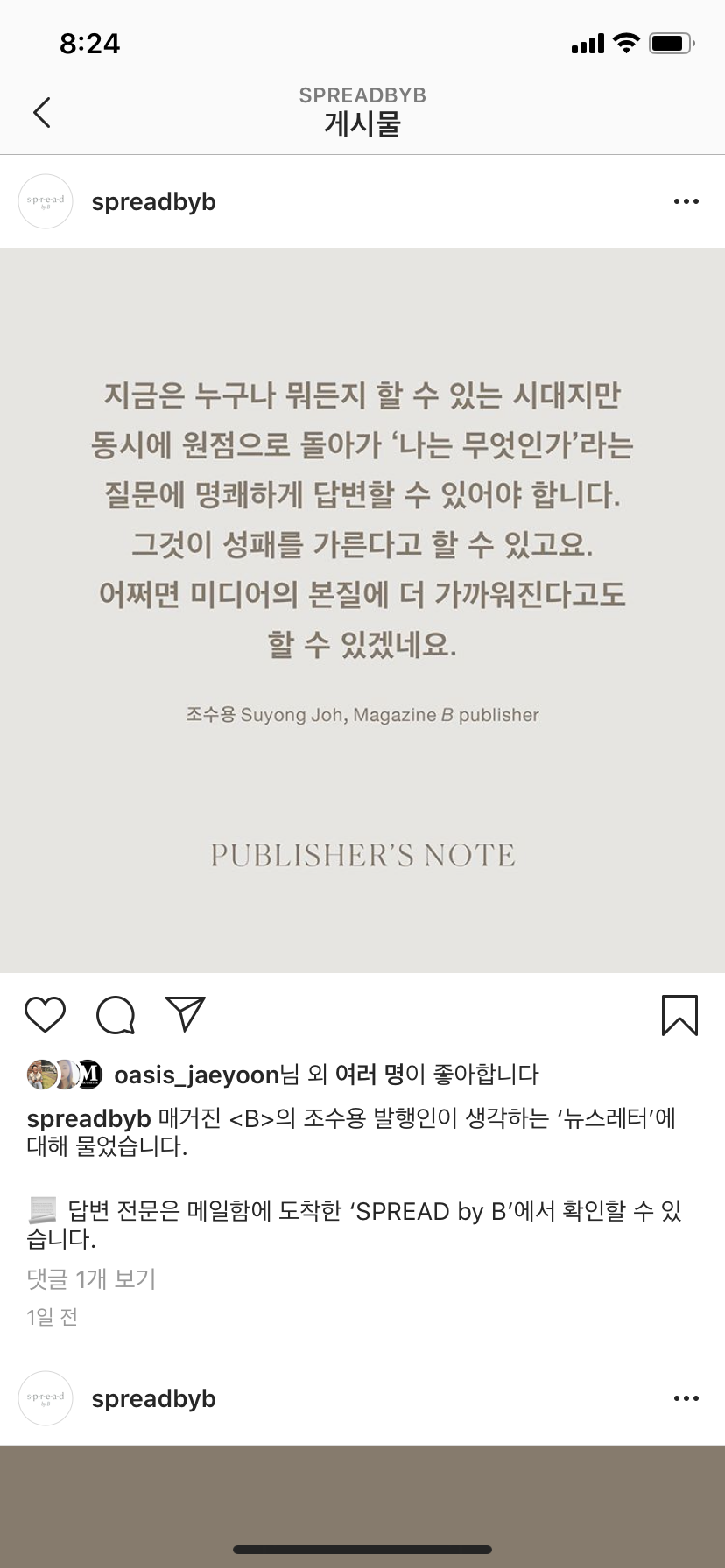 최근 다시 주목 받는 매체가 된 뉴스레터를 통해 매거진 <B>가 큐레이션한 브랜드 이야기를 할 것이라고, 매거진 <B>가 지금까지 다룬 브랜드는 물론 주변의 삶과 환경, 나아가 산업 지형에 영향을 주는 크고 작은 브랜드와 기업, 크리에이터의 행보와 변화를 지속적으로 관찰해 담아낼 것이라고 한다. '퍼뜨리다', '펼치다'라는 의미의 'spread' 처럼 뉴스레터 ‘SPREAD by B’가 이러한 소식을 퍼뜨릴 수 있기를 바란다고 포부를 밝혔다.