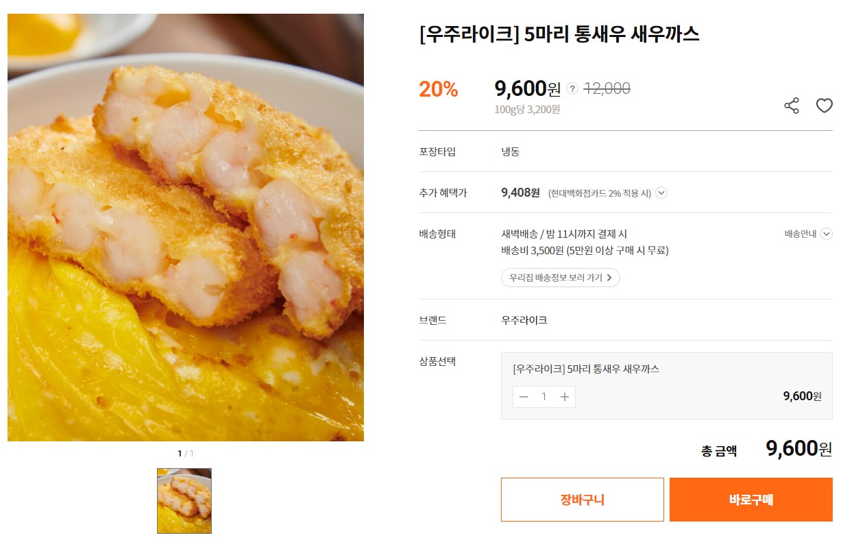 현대백화점 투홈을 통해 구입한 우주라이크 5마리 통새우 새우까스를 먹어보았다.