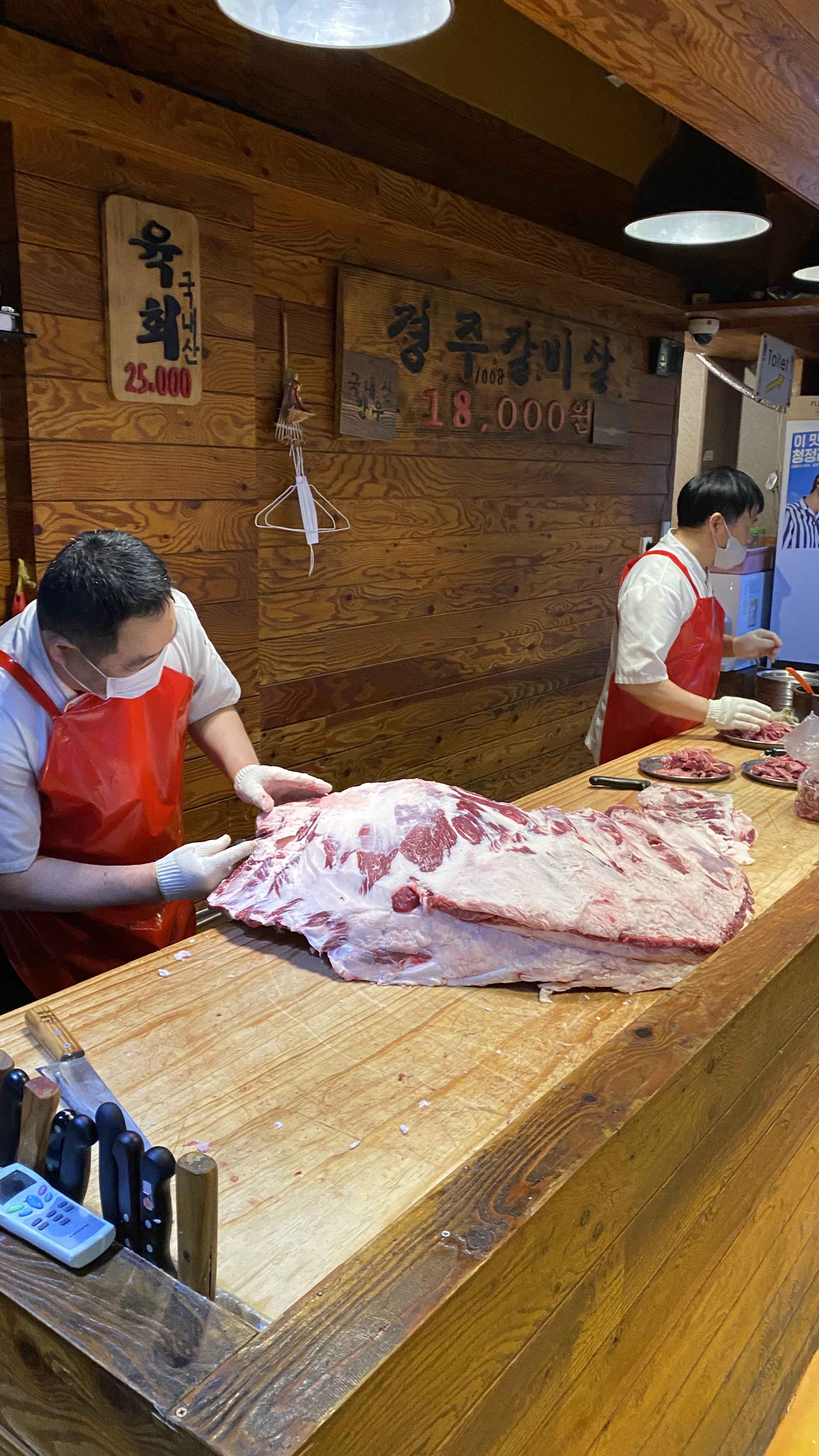 들어올 때 못봤는데, 정신차리고 나갈 때 보니 이러한 공간이 있더군요. 오픈형 주방과 같은 효과를 주는 '신선한 고기'를 사용한다는 느낌을 주네요.