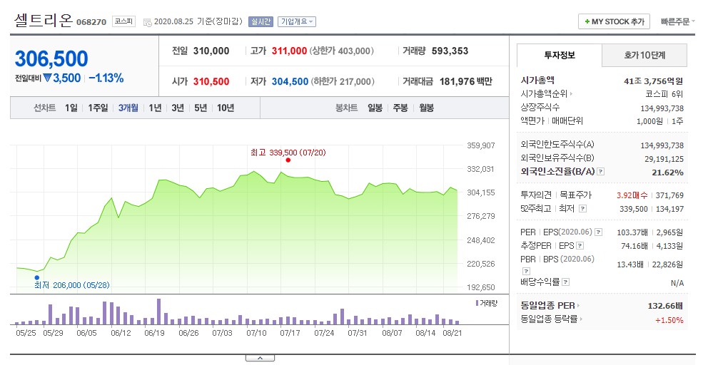 시가총액 약 41조, 코스피 6위, 삼성전자, 하이닉스, 삼성바이오로직스, 네이버, LG화약의 뒤를 잇고 있다. 3월 낙폭 대비 두배 가까이 올랐고, PER이 무려 103배이긴 하지만, 상승 여력이 조금은 더 있지 않나 생각한다. 무서운 성장성과 탄탄한 연구능력, 건실한 재무구조 등 바이오 기업 중 신뢰할 수 있는 기업이라고 생각한다.