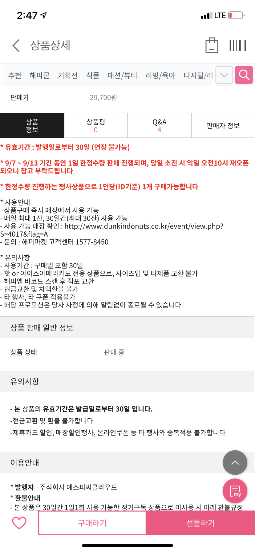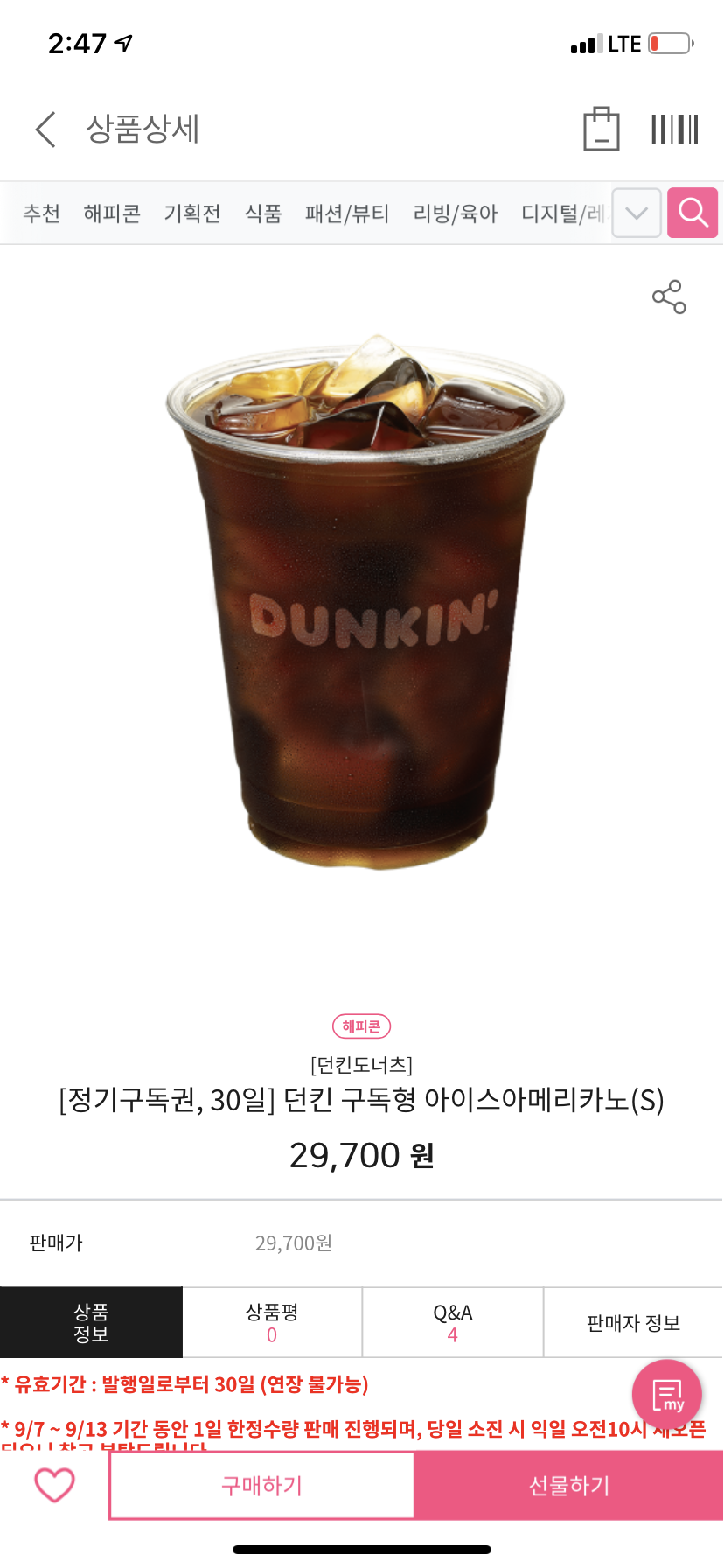 던킨의 아메리카노 한 잔 가격이 3,500원이므로, 30잔이면 정가 기준 105,000원이다. 29,700이면 정가 대비 약 28% 할인율이다. 105,000 가격을 29,700원에 해준다는 생각을 하면 굉장히 큰 혜택을 주는 것 같은데, 단순 28% 혜택이라는 생각을 해보면 또 그리 크지 않아 보이고. ㅎㅎ 소비자 판단의 몫일 것 같다. 직장 근처에 있든, 집 근처에 있던 30잔을 빼놓지 않고 챙겨 먹기는 쉽지는 않아 보인다.
