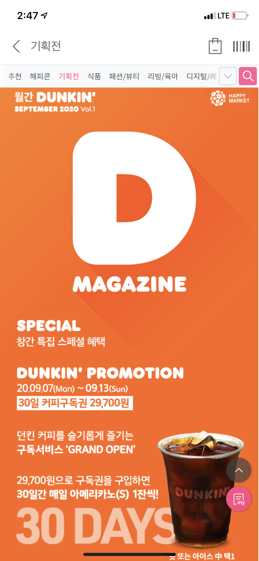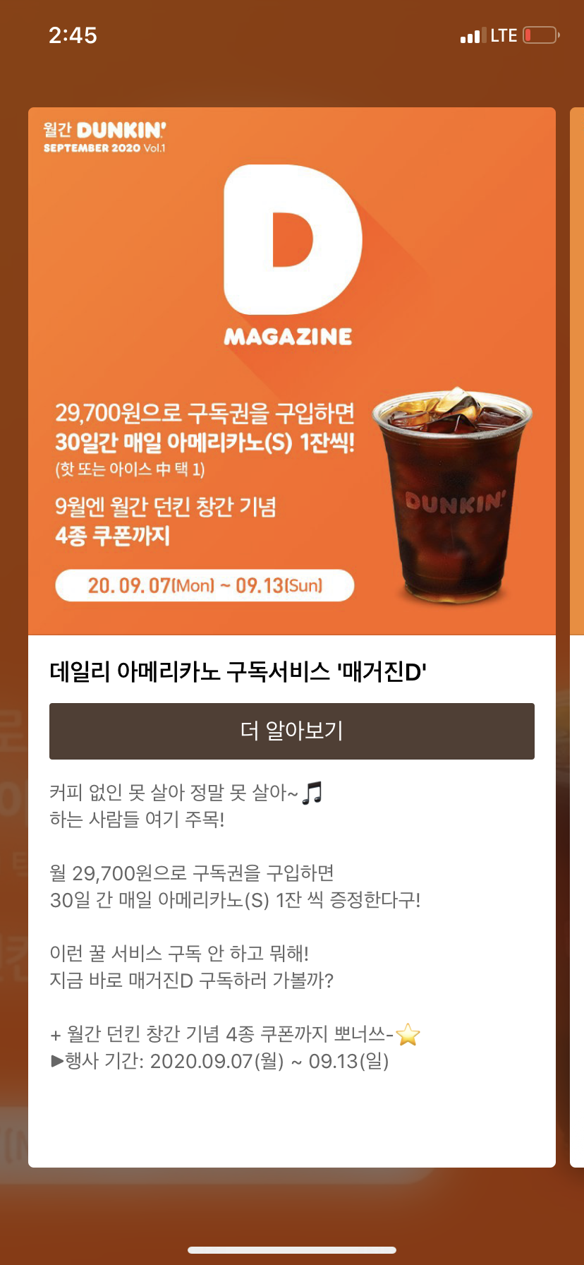 매월 커피 구독을 기본으로하여, 각종 프로모션을 진행하려고 하는 듯 하다. 9월 '월간 던킨' 창간 기념으로 4종의 쿠폰을 지급한다고 한다. 판매기간은 9월 7일부터 13일까지.