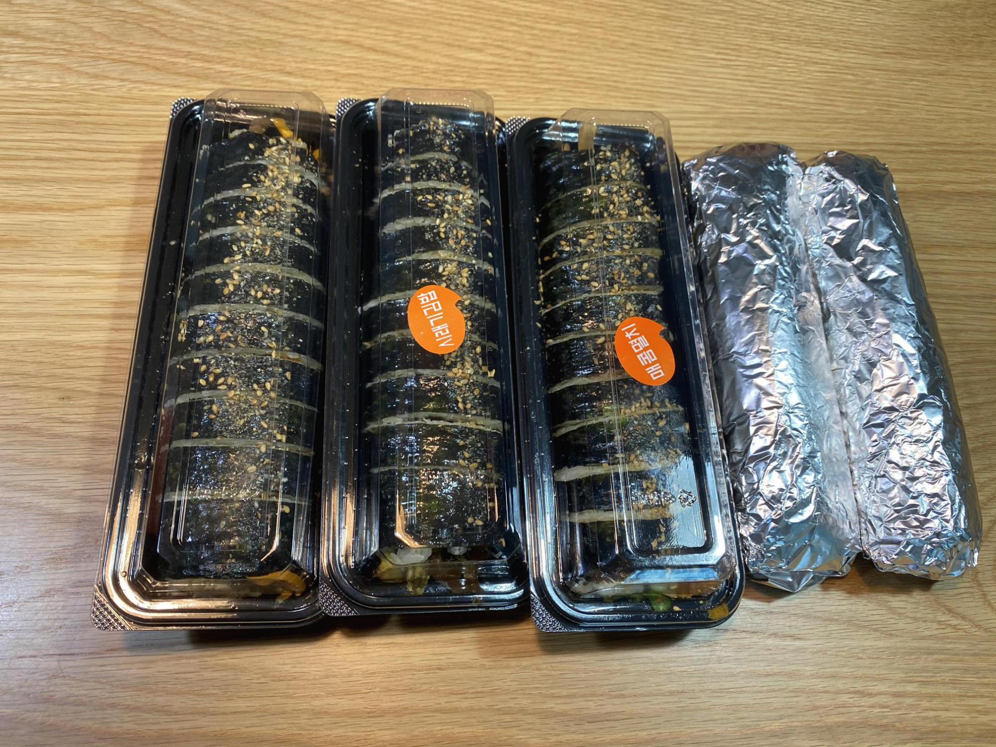아무 것도 붙어 있지 않은 것이 메인 메뉴인 묵은지 참치 김밥, 은박지에 쌓여 있는 것이 한입김밥, 나머지 시래기, 매콤멸치는 스티커가 붙어 있습니다.