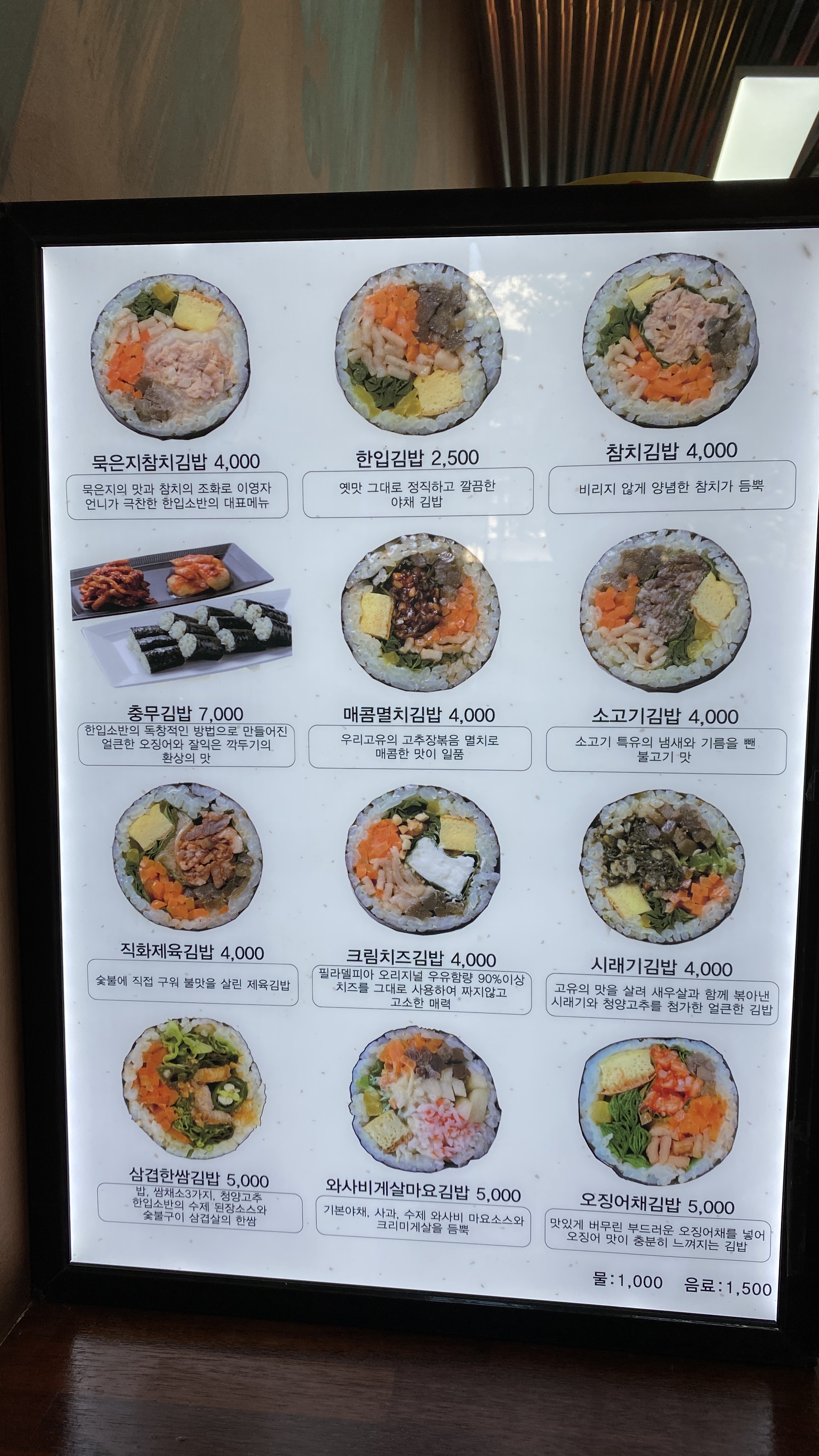12가지의 김밥 메뉴가 있습니다. 시그니처인 묵은지 참치 김밥이 첫번째 메뉴네요. 가격은 4천원입니다. 그 외 한입김밥, 충무김밥, 매콤멸치김밥 등이 있습니다. 키오스크 사진은 찍지 못했는데, 주문도 키오스크로 합니다. 생각보다 어렵지는 않구요. ㅎㅎ