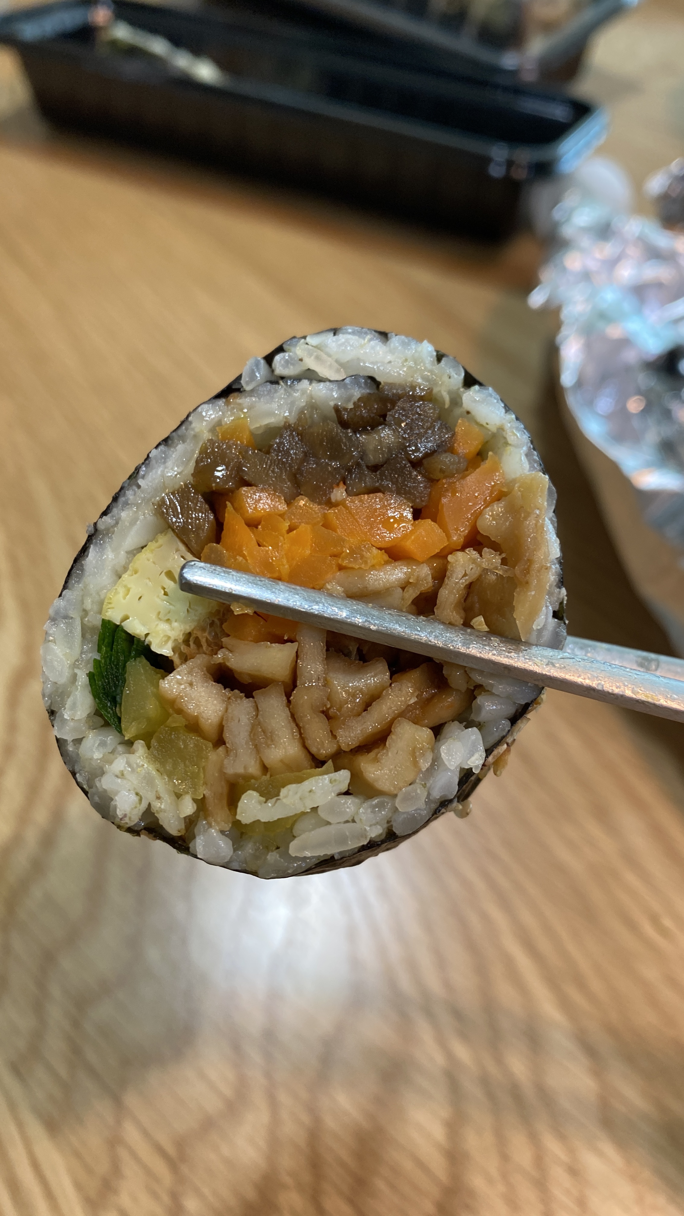 키오스크로 주문이 완료되면 자동으로 주방에 전달이 됩니다. 주방에서는 주문을 확인하고, 김밥을 말고 카운터에 김밥을 내려 놓으면 손님이 수량에 맞추어서 봉지에 넣어갑니다. 저역시 봉지에 김밥을 넣고 집으로 와서 하나 하나 먹어 봅니다. 처음갔을 때 배도 고프고, 호기심도 일고 해서 몇가지 메뉴를 시켜보았습니다.