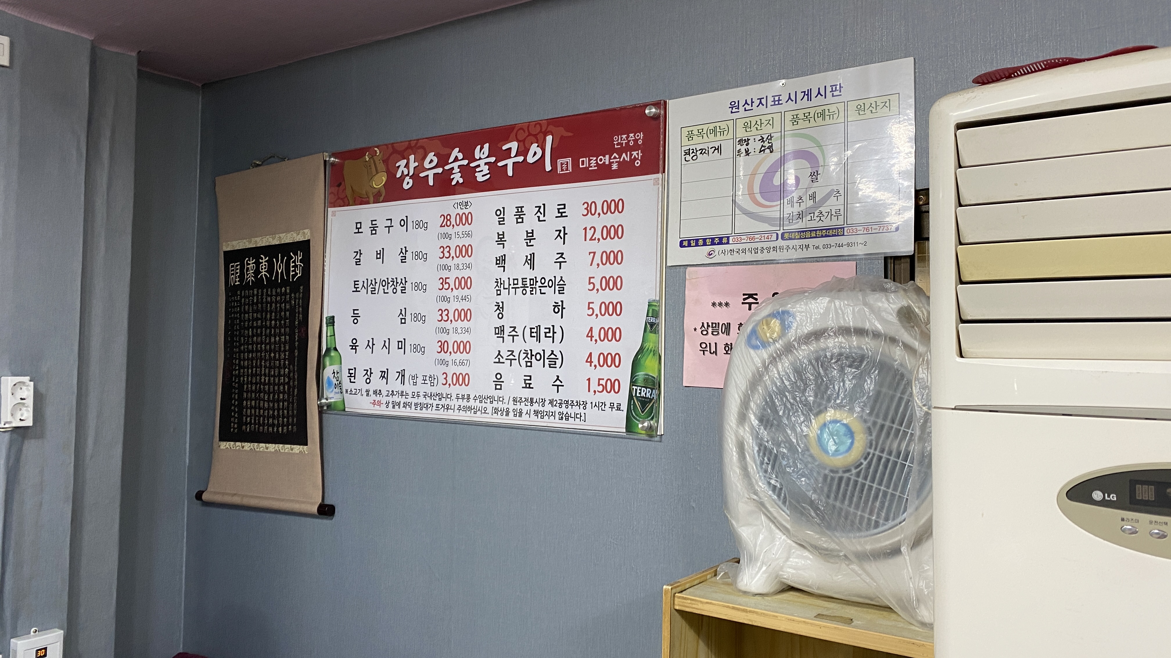 장우숯불구이 메뉴입니다. 당연히 한우이며, 180g 단위로 판매하고 있습니다.