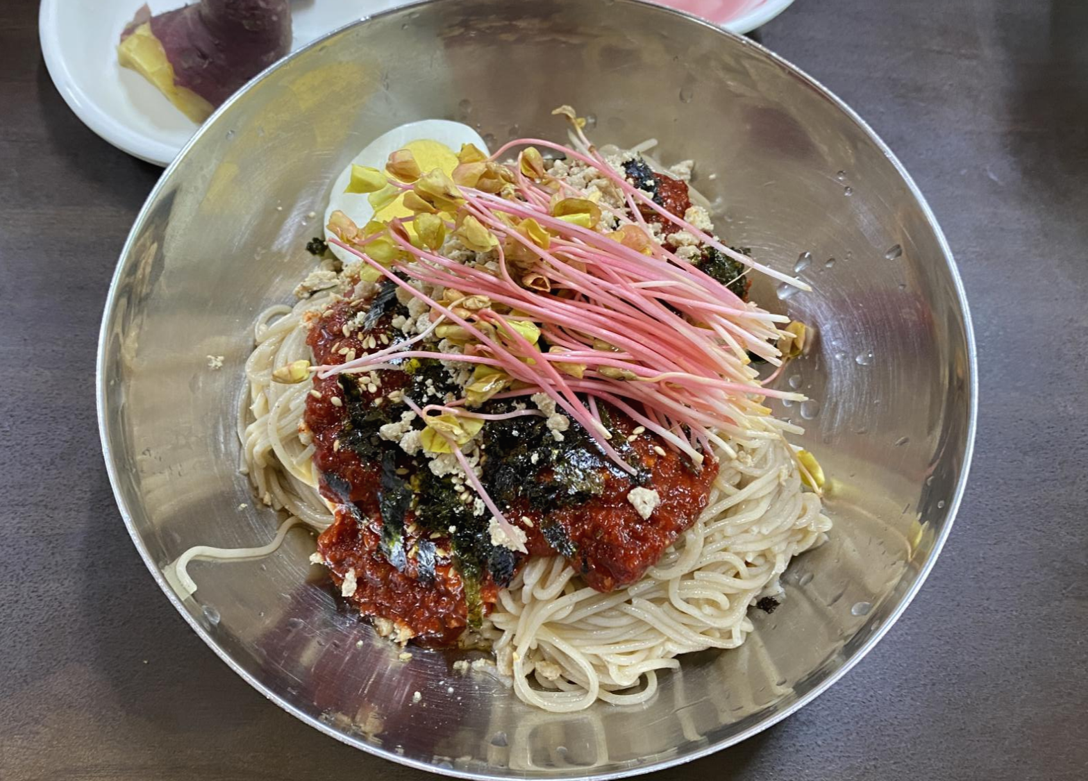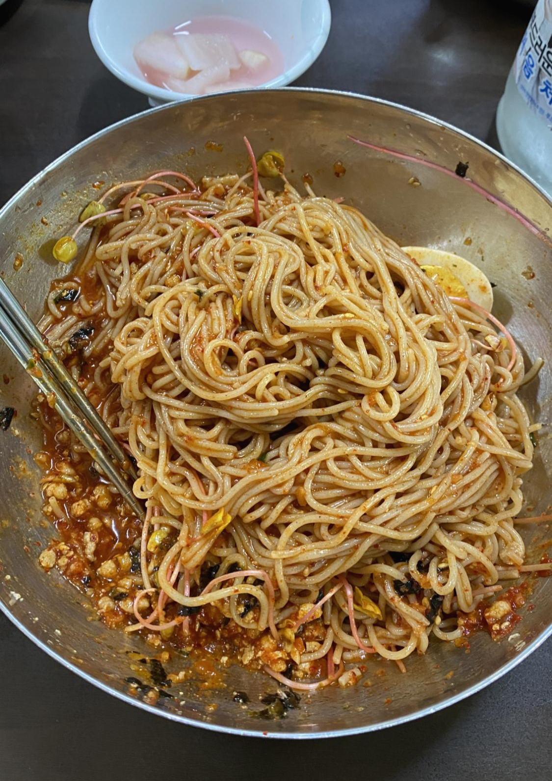 비벼봅니다. 그간 먹었던 강원도 막국수와는 다소 다른 점이 붉은 무순도 그렇지만 다진 돼지고기가 들어가 있었다는 점입니다. 동치미를 조금 넣고 비벼봅니다. 쓱쓱. 한 입 먹어보니 별 다를 것 없는 다소 평이한 맛입니다. 담백한 비빔면 느낌이었다고 하면 맞을까요? 절반 정도를 비빔으로 먹고, 절반은 동치미를 넣고 물막국수로 먹었습니다. 물막국수가 조금 나았습니다.