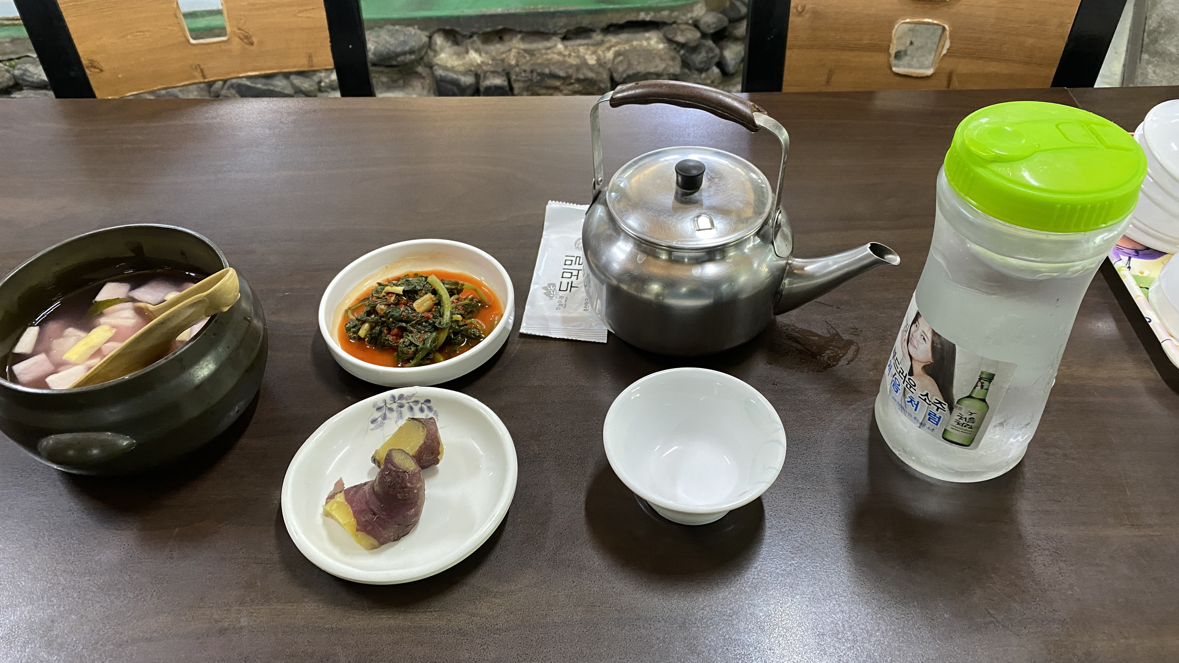 주문한지 얼마 지나지 않아 기본 찬이 나왔습니다. 무동치미와 열무김치, 따뜻한 면수가 나오네요. 특이하게도 삶은 고구마가 나왔습니다. 고구마는 후식으로 하나 먹었습니다.
