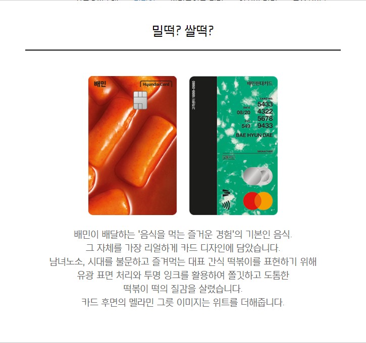 갖고 싶은 디자인을 지닌 카드를 만들기로 정평이 나있는 현대카드와, 역시 재치있는 디자인과 카피로 이름 난 배달의 민족이 손을 잡았다. 그 결과 기존의 금융업의 도식을 벗어난 디자인을 만들어 냈다. 언론에서는 전용 혜택을 위주로 카드 소개를 했지만 관심있는 것은 디자인이므로 카드의 디자인 위주로 살펴보고자 한다.