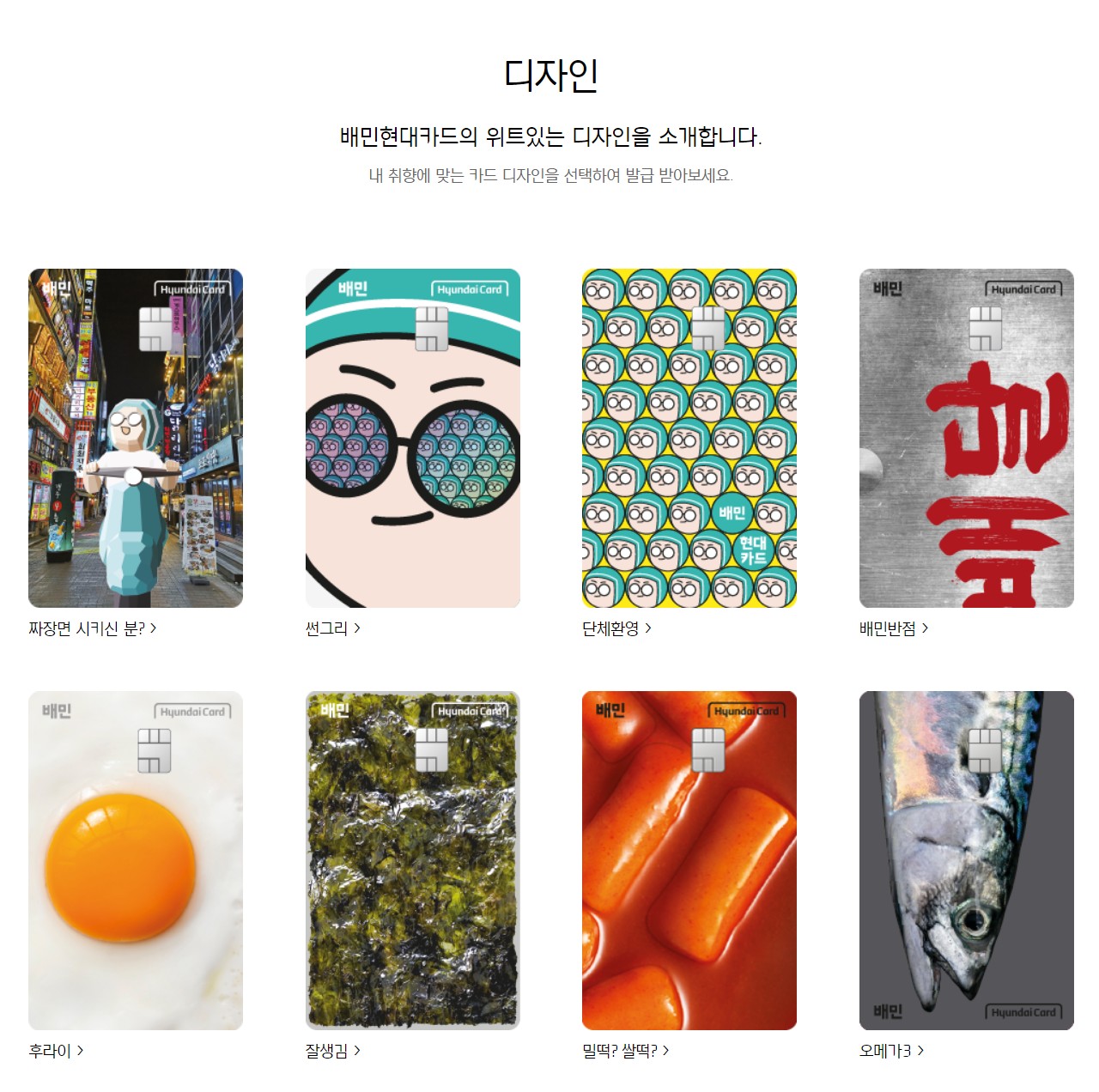 배민현대카드는 아래 이미지대로 총 8종으로 출시된다. 다 귀엽고 특이한 디자인이지만 계란후라이와 김, 떡볶이 카드가 가장 마음에 든다.