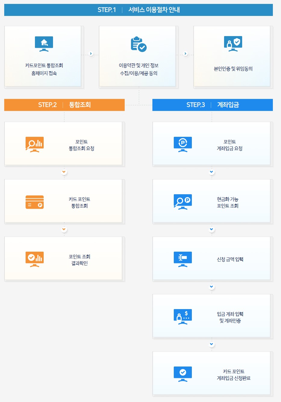 카드포인트를 제대로 쓰기가 쉬운 일은 아니다. 여러 장의 카드를 사용하는 경우 포인트 적립률도 낮은 데다가 딱히 사용할 곳도 없어서 통상적인 유효기간을 넘겨 소멸되는 경우가 대부분이다. 이러한 불편을 해소하기 위해 정부는 여신금융협회를 통해 카드포인트 통합 조회 후 현금으로 이체할 수 있는 서비스를 마련해 놓았다.