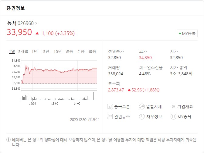 동서 주가가 전일 대비 12.74% 상승한 38,500원에 마감했다. 안정적인 회사의 주식이지만, 개인투자자들 사이에서는 변동 폭이 크지 않아 재미없는 종목으로 인식되던 동서의 주가가 어제에 이어 오늘도 크게 올랐다. 어제는 전일 대비 1,400원 상승, 오늘은 무려 4,350원이 오르는 기염을 토했다.
