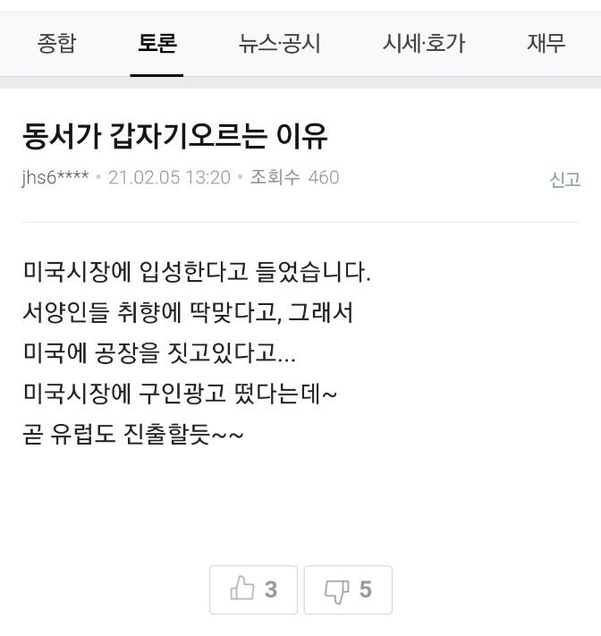 그럼에도 불구하고 외인들의 매수세가 뜨거우니 월요일 시장에서는 어떠한 흐름을 보일지는 모르겠다. 결국 선택은 각자의 몫일뿐. 넘치는 유동성의 희생양이 되지 않기를 바라며, 동서라는 회사에 관심을 가지고 있는 투자자로서 끄적여 본다.