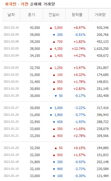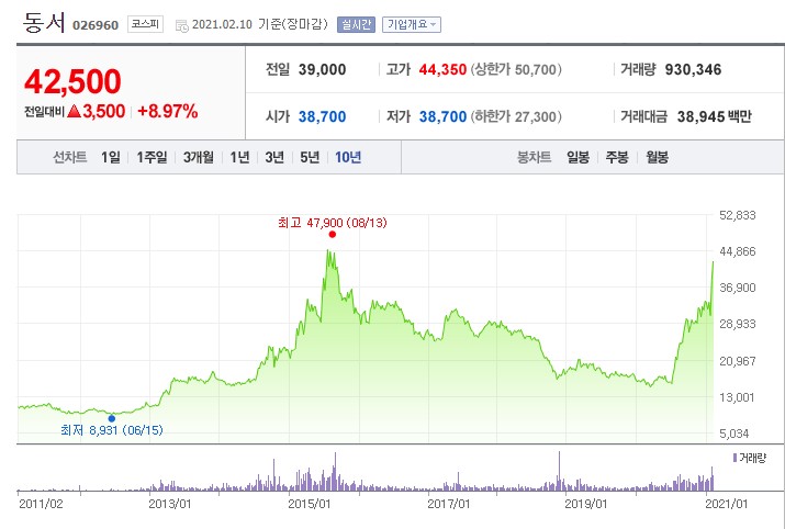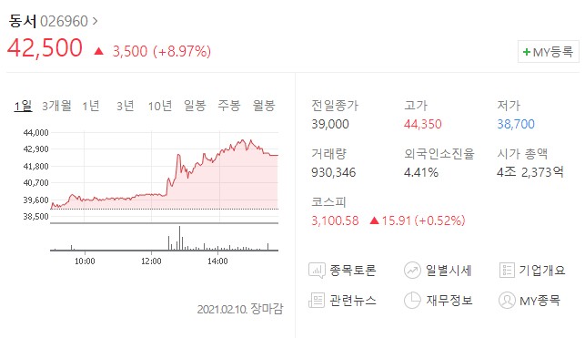 동서는 2월 10일 42,500원으로 장을 마감했다. 전일 대비 3,500원 약 9% 상승한 수치이다. 개인은 매도한 반면, 외국인과 기관투자자가 주가 상승을 주도했다. 외국인 투자자는 약 45억원을, 기관투자자는 약 14억원을 순매수했다. 반면 개인은 약 48억을 매도했다.
