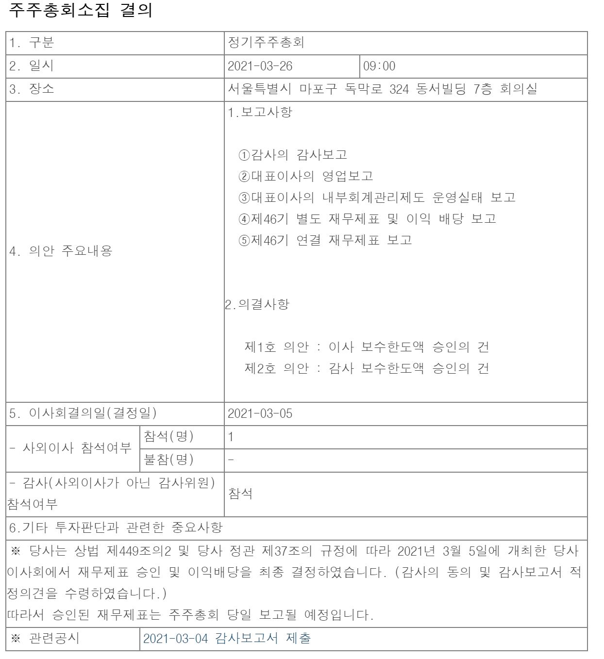 최근 동서의 주가 상승은 수출에 대한 기대감으로 인한 매수세가 컸다고 판단한다. 3월 5일 dart 공시를 확인한 결과 아래와 같이 동서의 주주총회 안건을 확인할 수 있다.