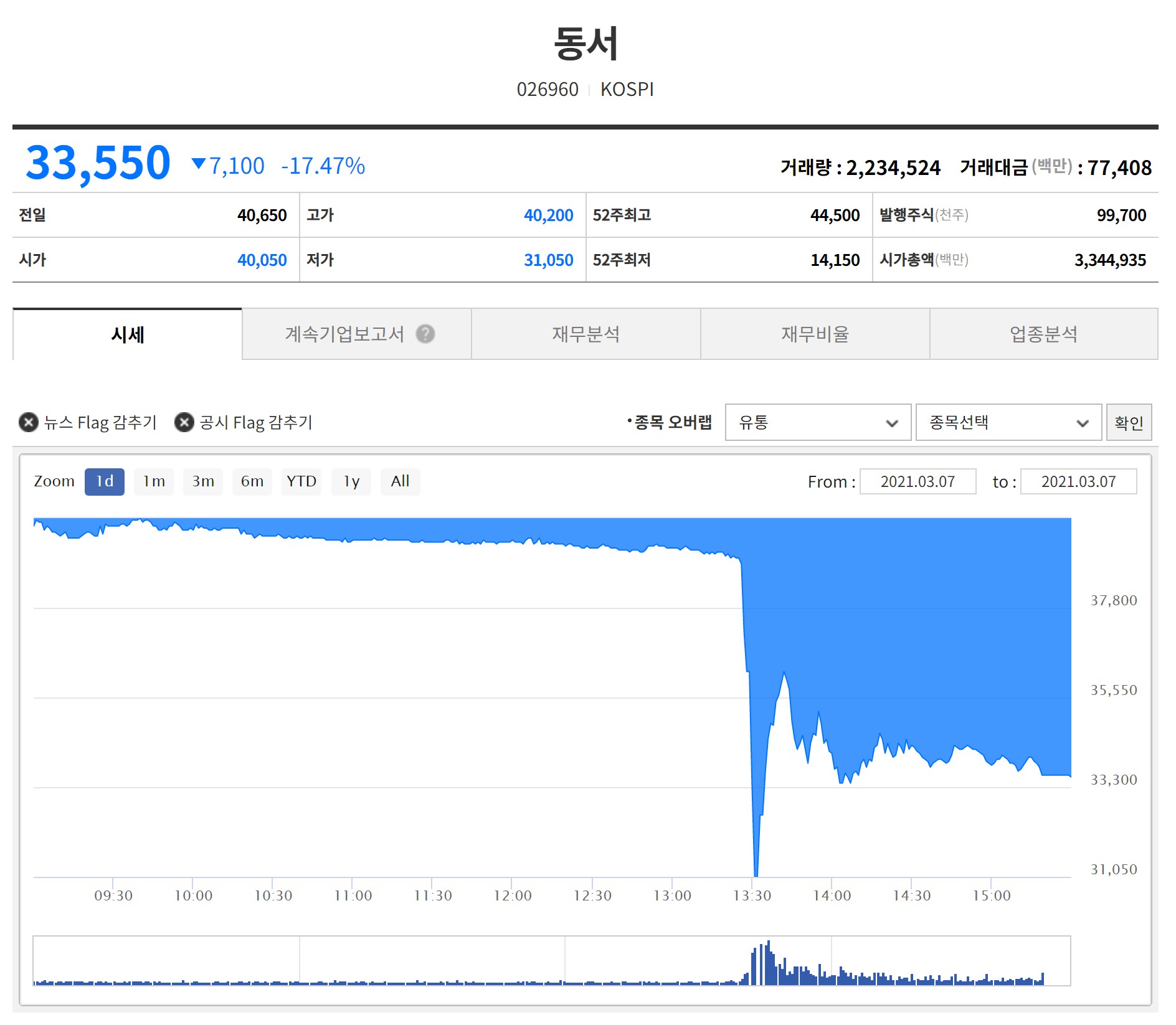 동서의 주가는 3월 5일 금요일 31,050까지 하락했다가 33,550으로 마감했다. 약 24% 하락했다가 17.47%로 마감한 것이다. 오후 1시 30분경 매도 물량이 쏟아지면서 가격이 폭락한 것으로 추정된다. 이 때에 위와 같은 공시가 나온 것인가? 확인하기는 어렵지만 시장의 충격은 매우 컸던 것으로 파악된다. 그렇기 때문에 위의 에이프릴 이슈는 더더욱 무관할 것이라는 판단이 설득력이 있어 보인다.