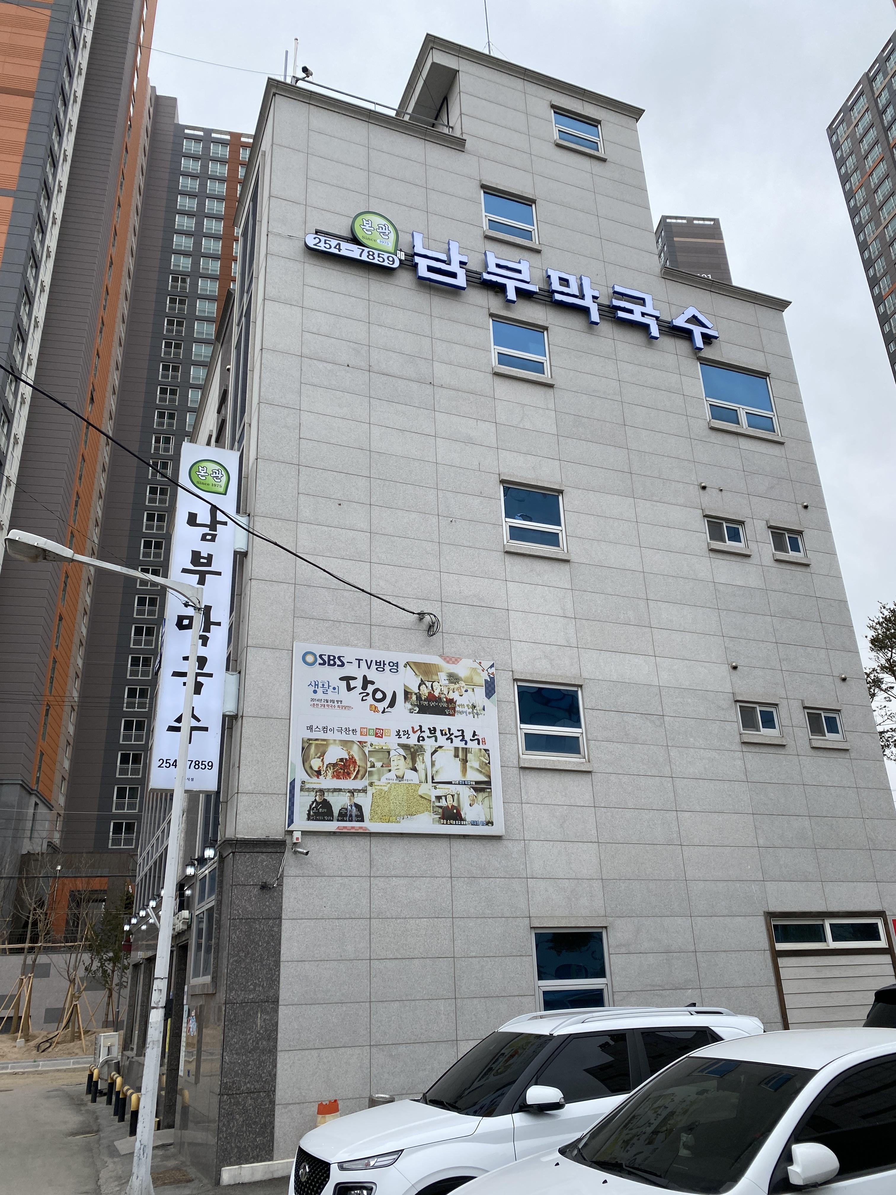 업무 차 춘천에 들렀습니다. 점심 시간이 되어 막국수나 한 그릇 먹고 다시 사무실로 복귀하기로 마음 먹었습니다. 인근 막국수집을 검색해보니 남부 막국수가 나옵니다. 일하던 곳에서 10분 내외의 거리라 차를 몰고 가봅니다. 모아엘가라는 신축 아파트 현장 사이에 남부 막국수 본관이 자리 잡고 있습니다.