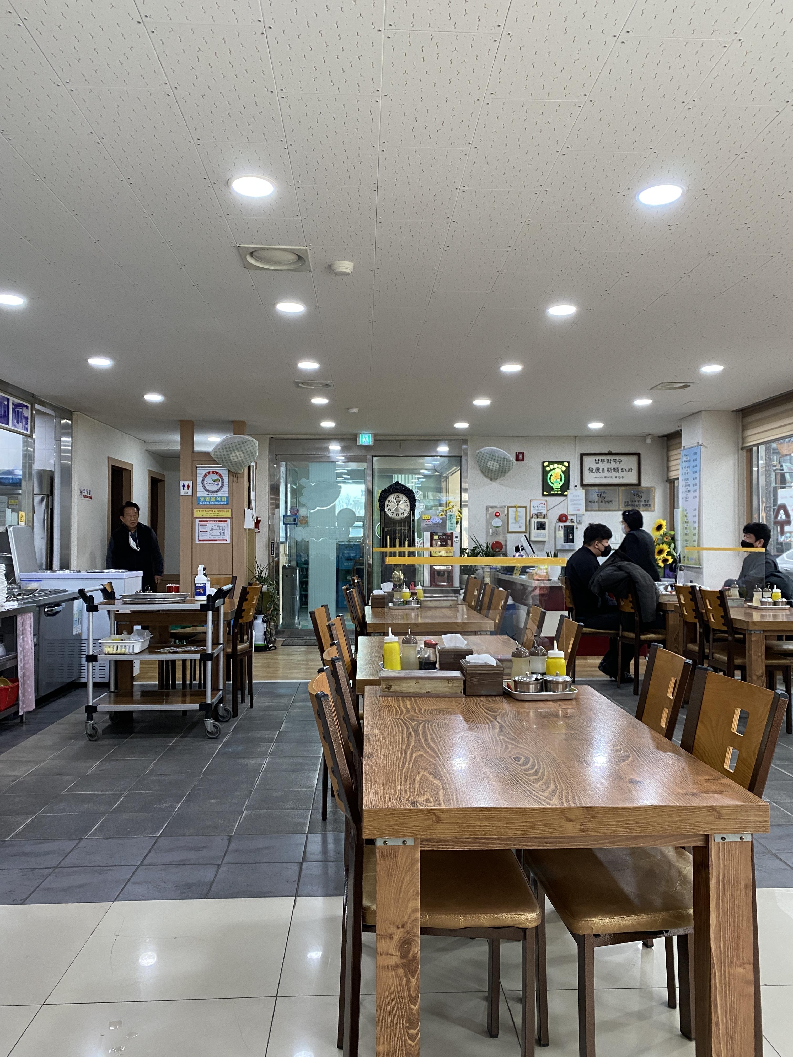 드디어 남부 막국수 본관에 들어갑니다 입구에 안심식당이라는 안내문이 붙어 있습니다. 안심식당은 예전에 포스팅에도 언급한 적이 있는 것 같습니다. 덜어먹기 가능한 도구를 비치 또는 제공하고, 개별포장한 위생적인 수저 제공, 종사자 마스크 착용 등 3대 과제를 지키는 식당에게 지정하는 제도입니다.