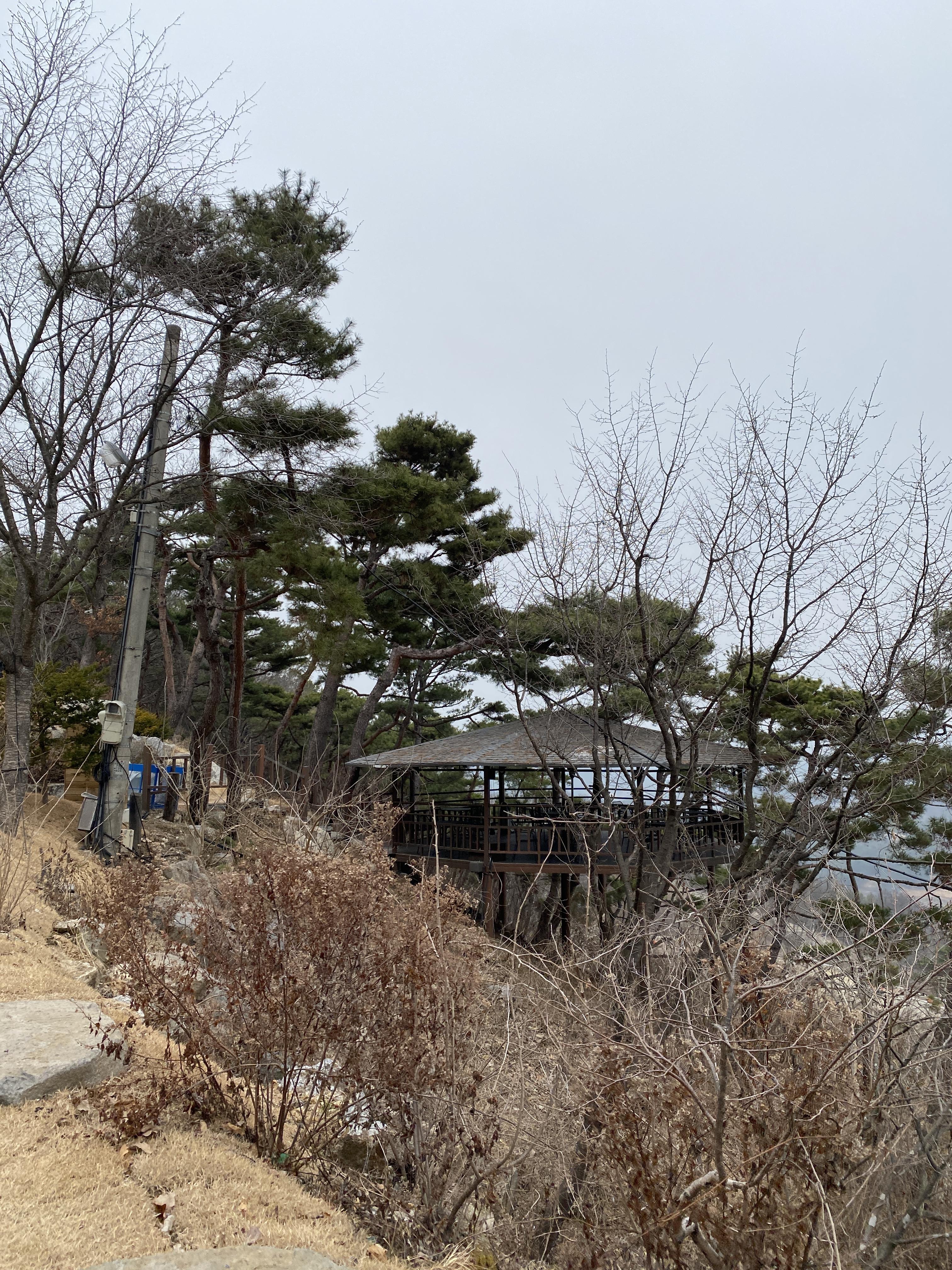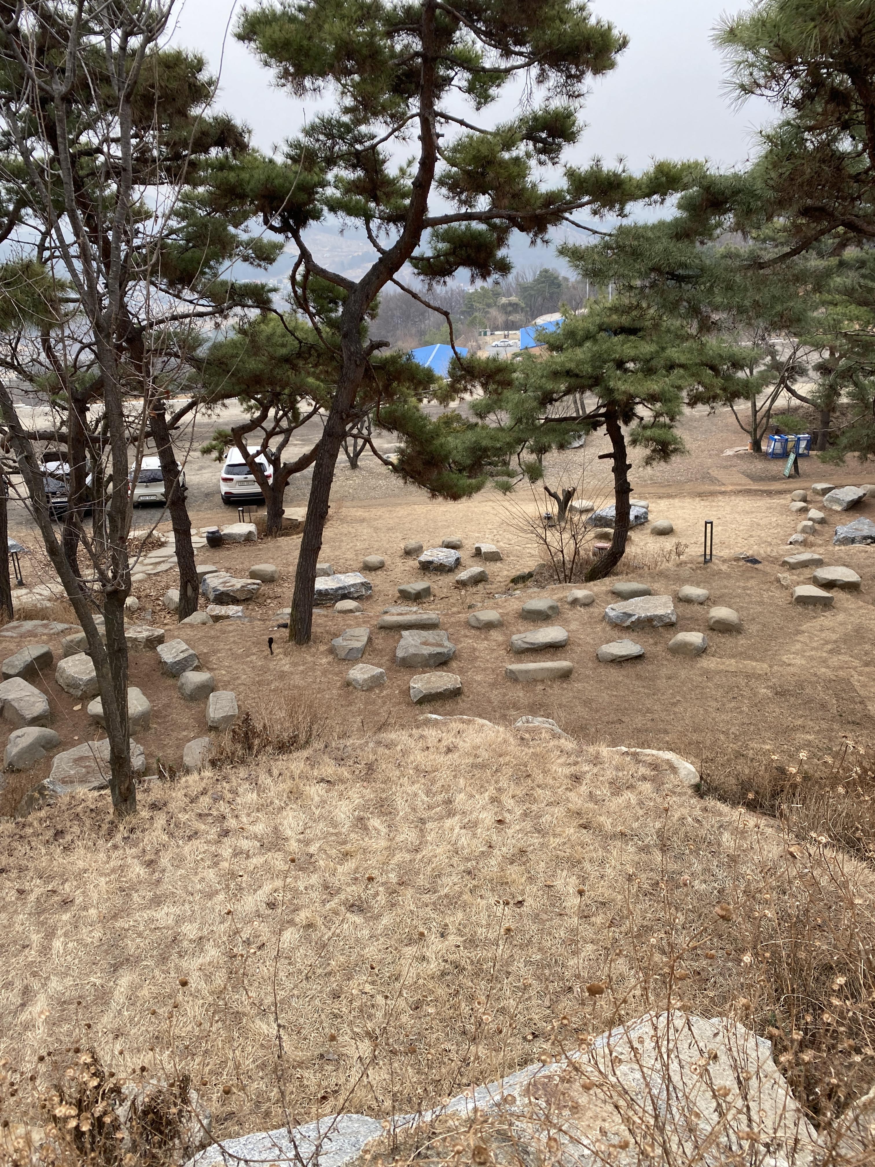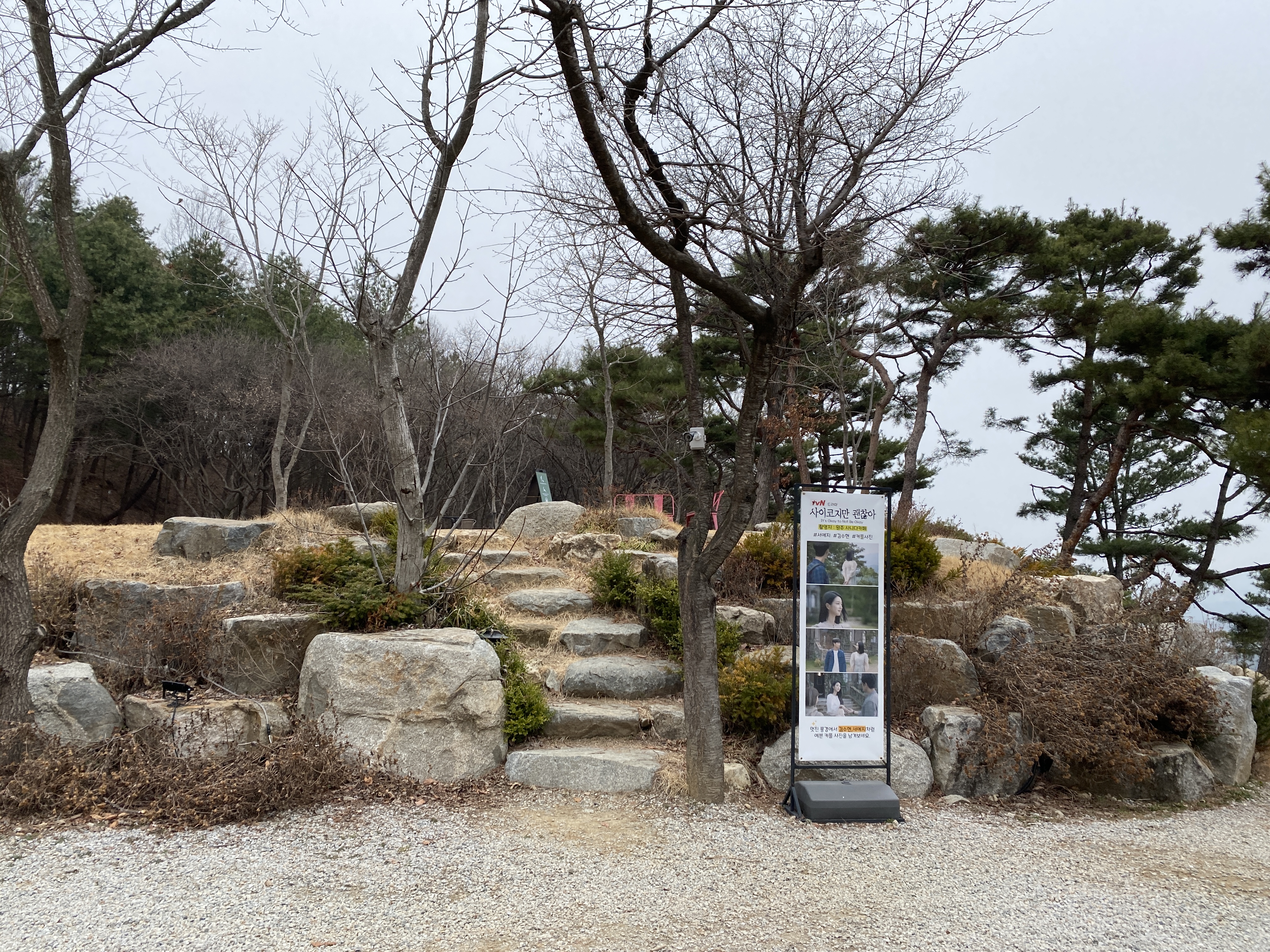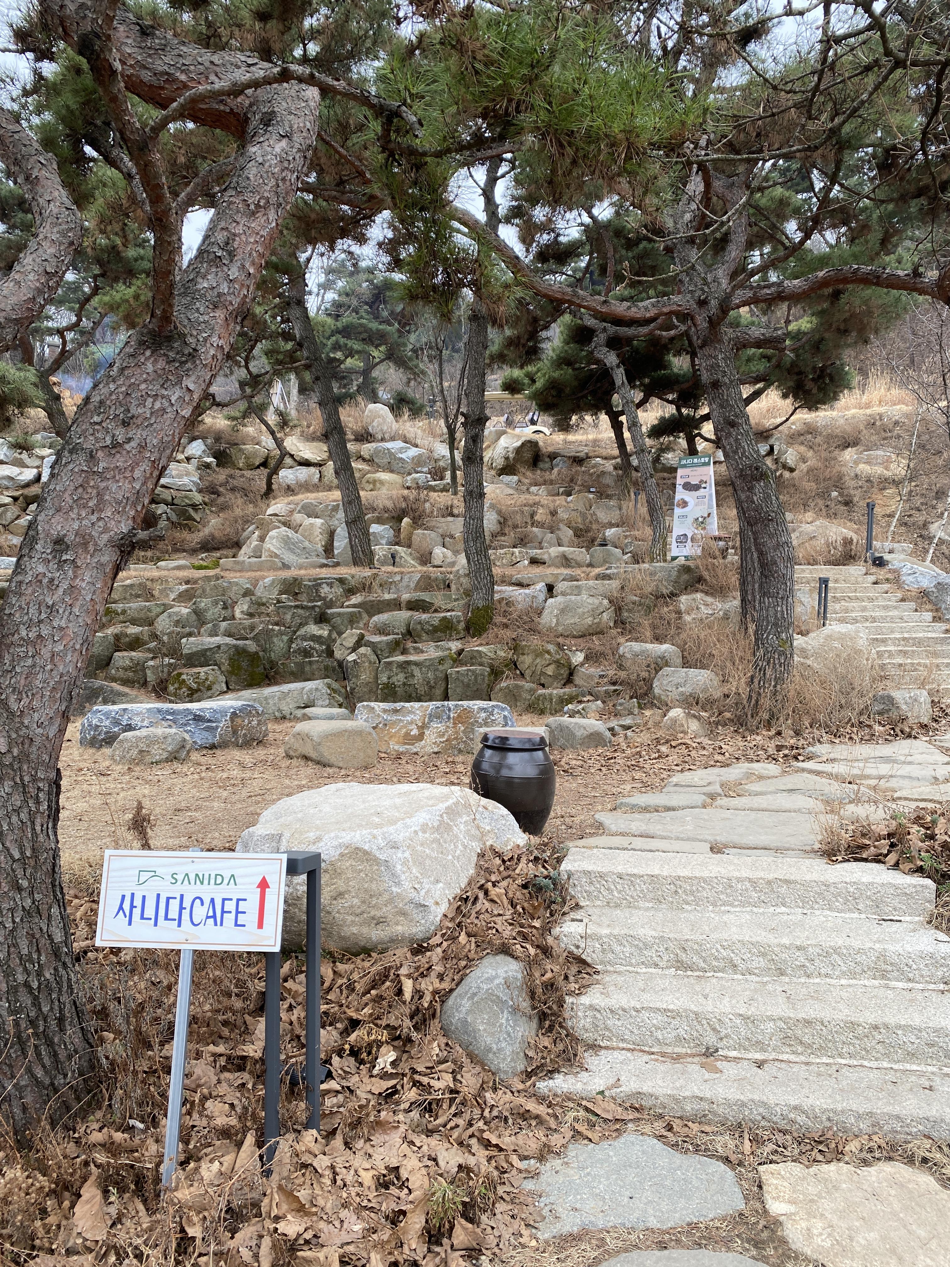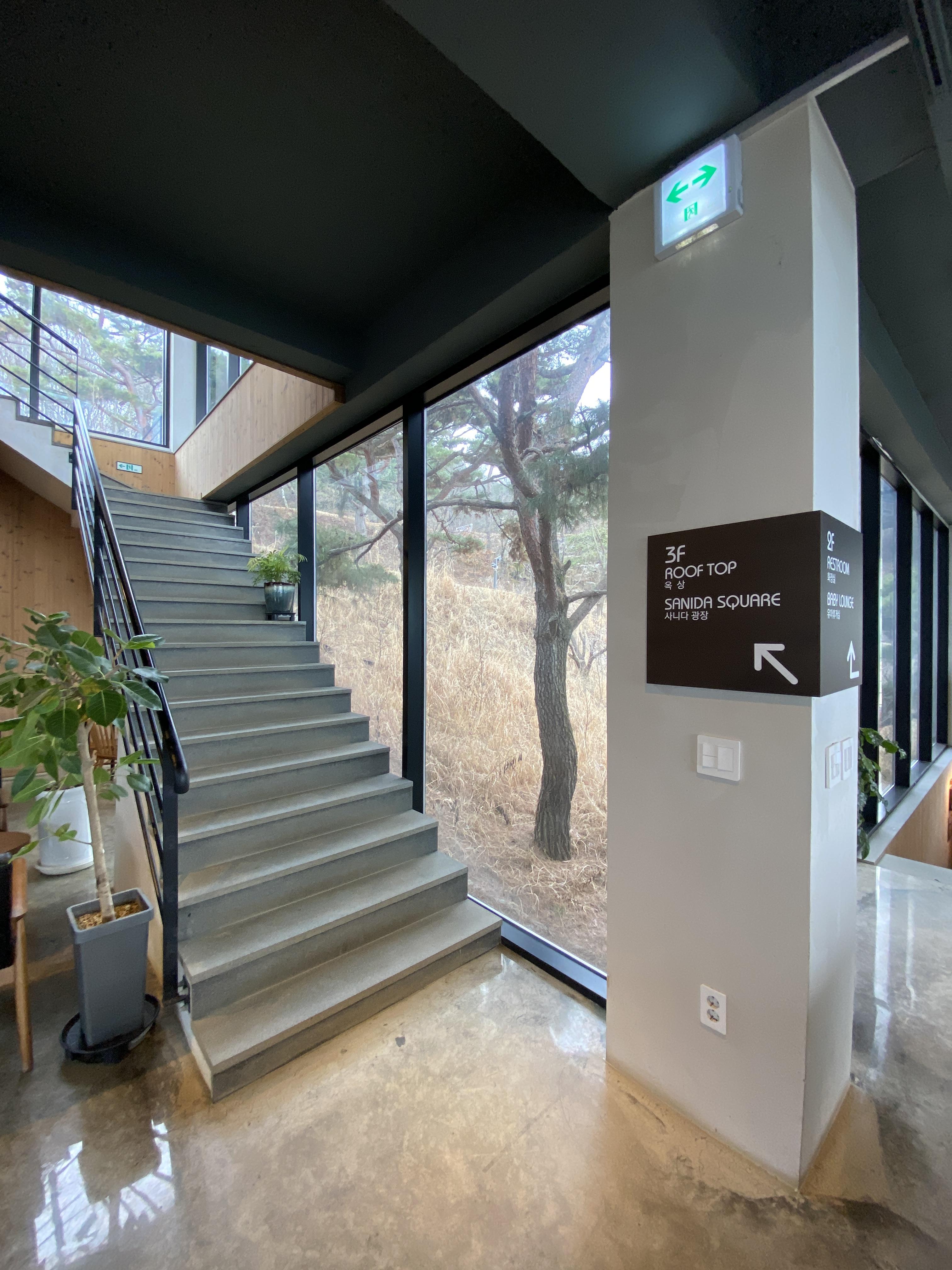 주차를 하고 사니다 카페로 올라가는 계단입니다. 곳곳에 소나무들이 많은데, 식수를 한 것이라 생각했으나, 최대한 기존의 나무들을 살려놓은 것이라고 하네요.