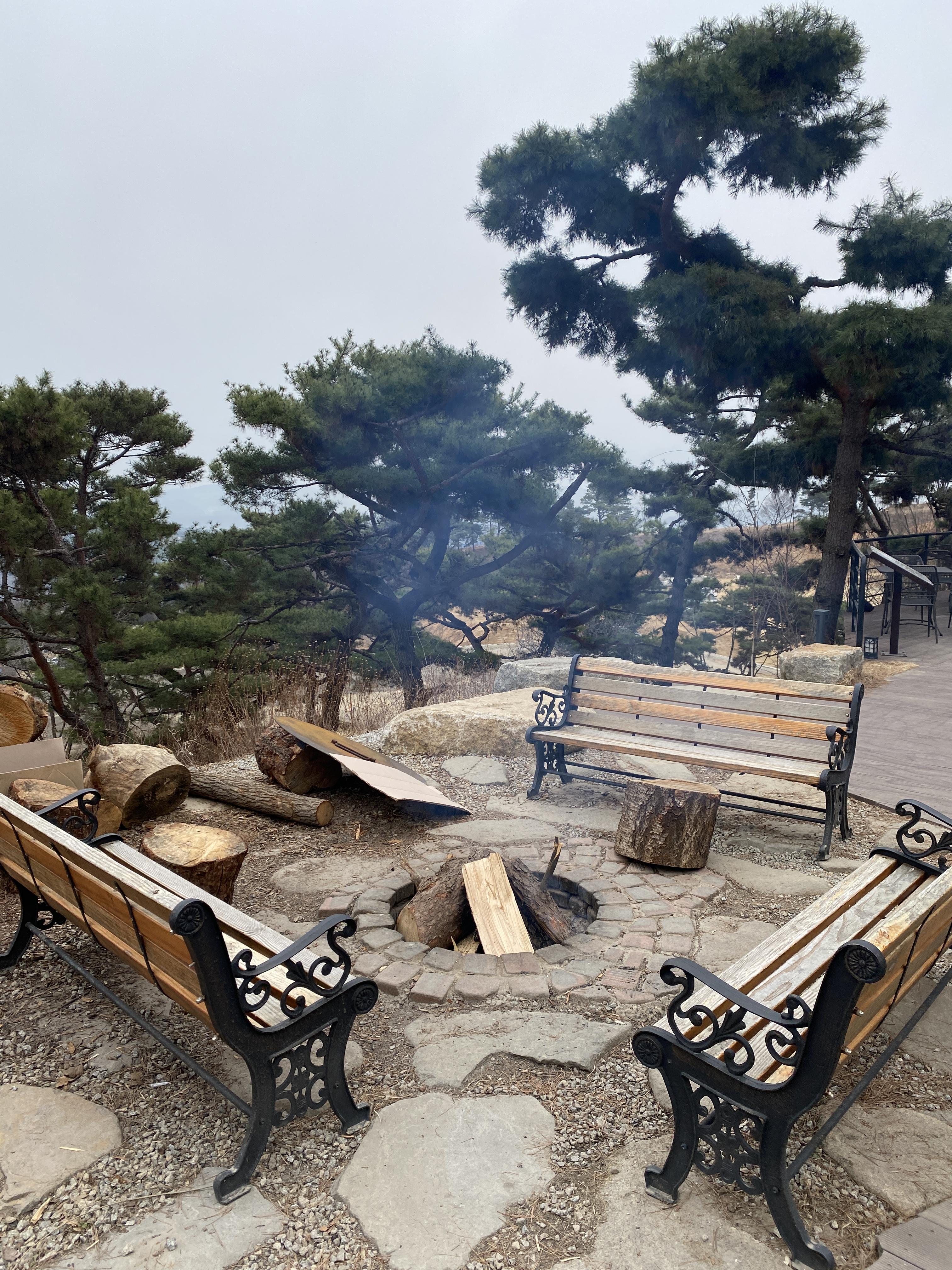 장작불이 타고 있습니다. 정취를 위해 이렇게 통나무를 이용한 모닥불을 태우는 것 같았습니다. 흰연기가 계속 나고 있네요.