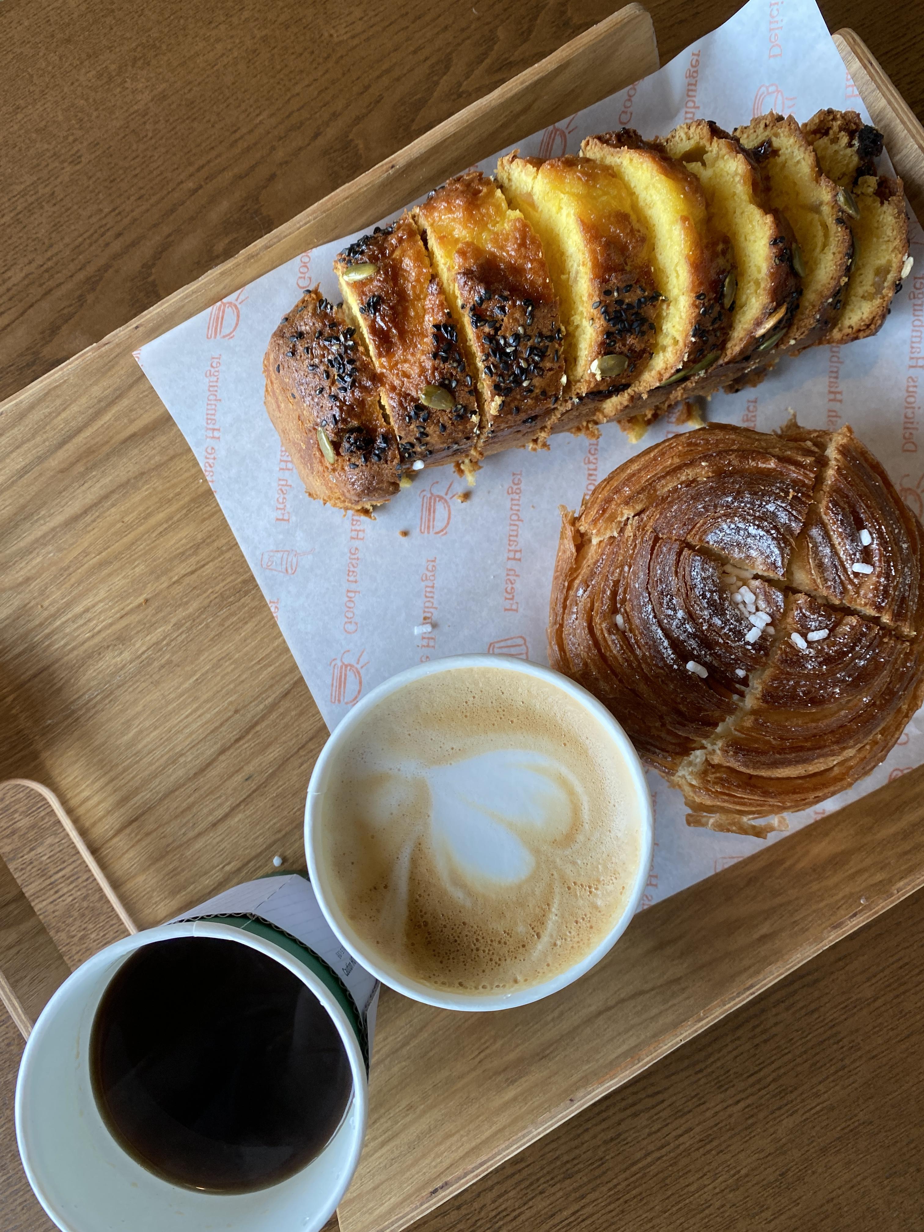 주문한 빵과 커피, 빵과 커피 모두 무난했습니다. 가끔 이러한 곳에 가면 형편없는 커피를 맛볼 때가 있는데 그렇지는 않았습니다. 가격이 비싸니, 그랬다면 화가날 뻔 했습니다. ㅎㅎ