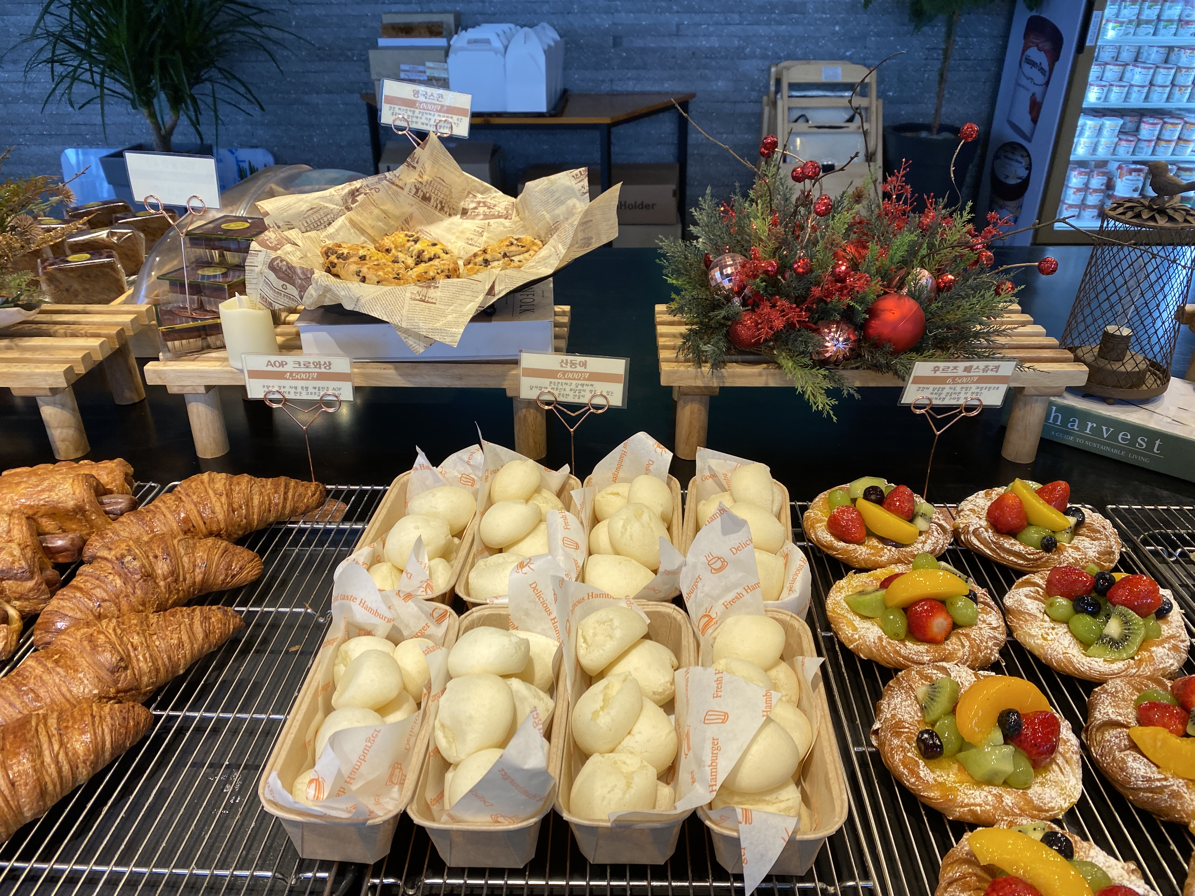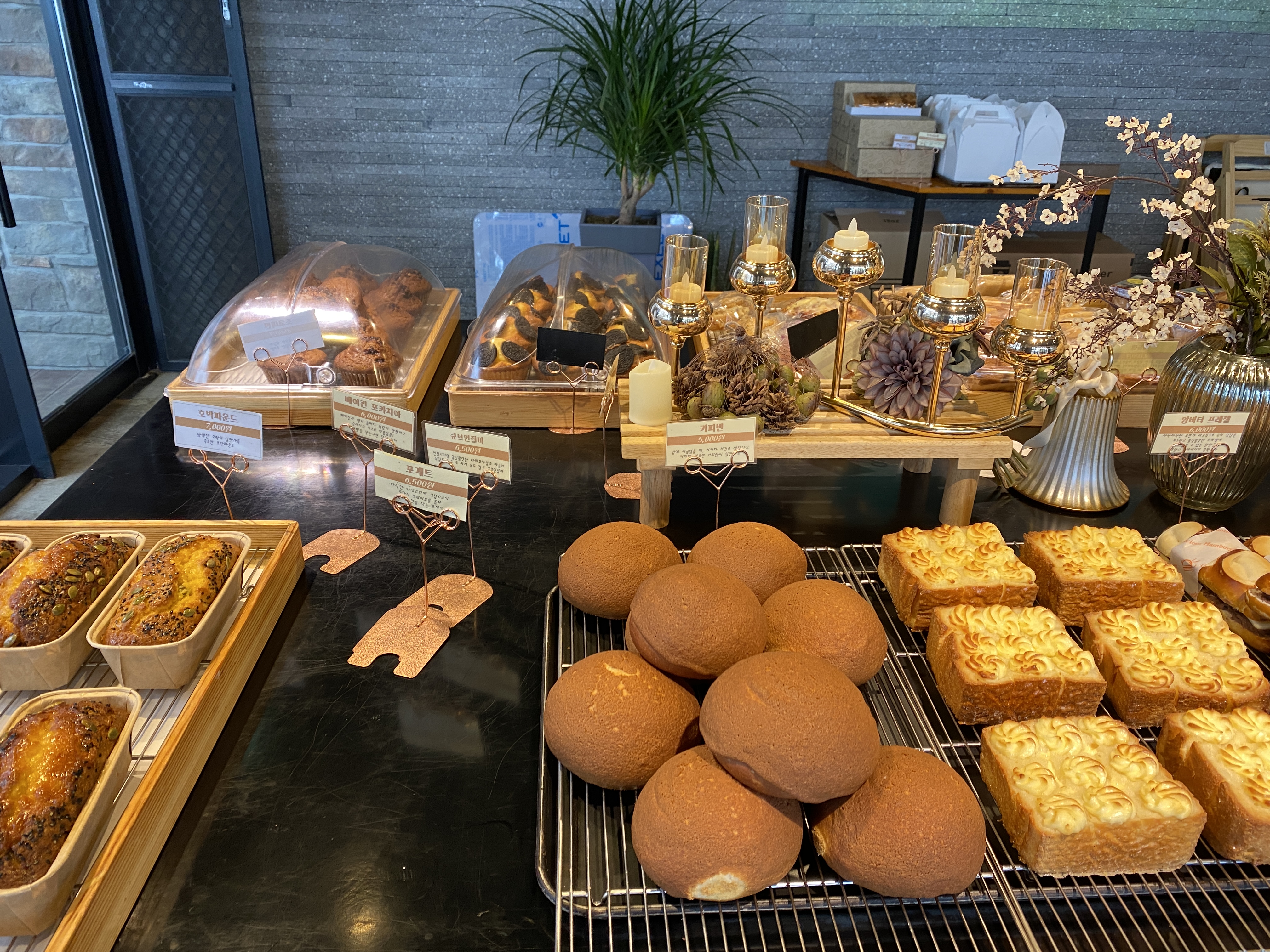 매장 규모에 비해 빵 종류는 많지 않은 것 같았습니다. 몽블랑, 호박파운드케익, 크로와상 등 다양한 빵을 판매하고 있습니다. 가격은 지방 도시 물가를 감안할 때 결코 싸지 않습니다. 몽블랑 7천원, 크로와상 4천5백원 등 좀 비싸다고 생각되네요. 하긴 요즘 많이 생기고 있는 대형 카페들의 커피, 빵 가격과 비교해보면 비슷한 수준인 것 같기도 합니다.