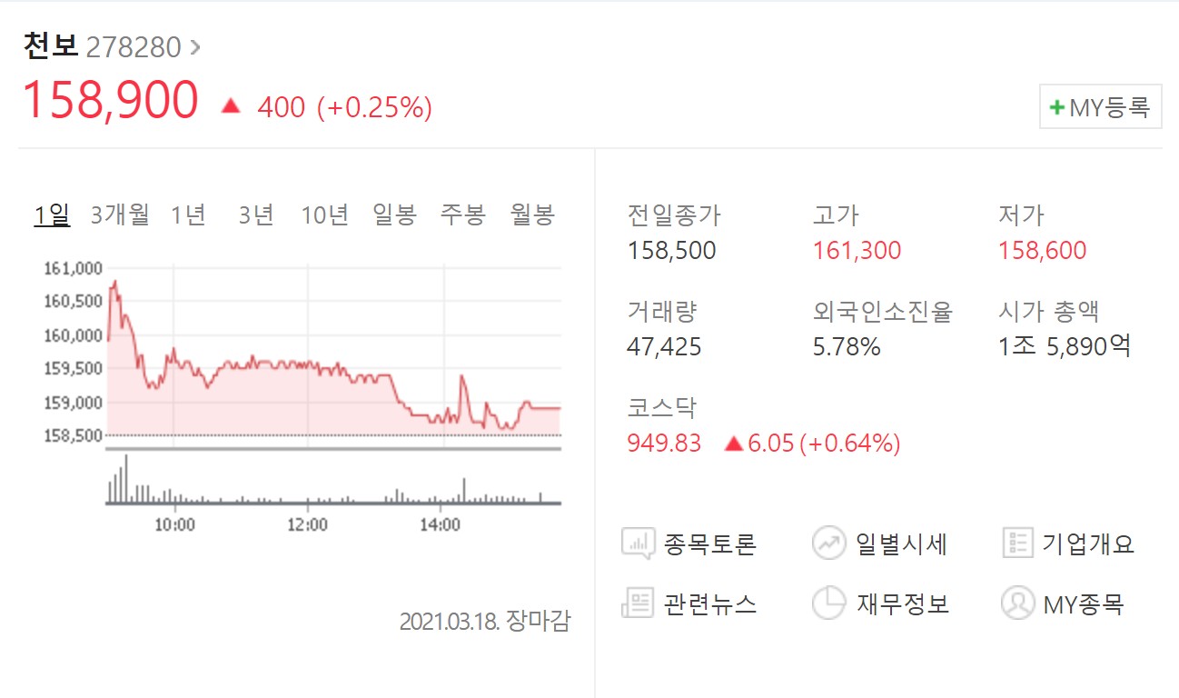 그렇지만 앞서 살펴본 바와 같이, 천보만이 가진 경쟁력이 있기 때문에 이는 일시적인 조정에 불과하다는 판단이다. 그래서 지금이 매수 기회라는 생각에 포트폴리오에 천보를 추가했다. 외국인 소진율이 6%가 되지 않고, PER도 성장주 답게 58배가까이 되지만, 성장 잠재력은 물론 빠른 이익 회수도 가능하다는 판단에 과감하게 포트폴리오에 넣게 되었다. 애널리스트들의 대체적인 의견은 20만원 중반을 목표가로 삼았는데, 머지 않아 이 주가에 근접하지 않을까 생각한다.