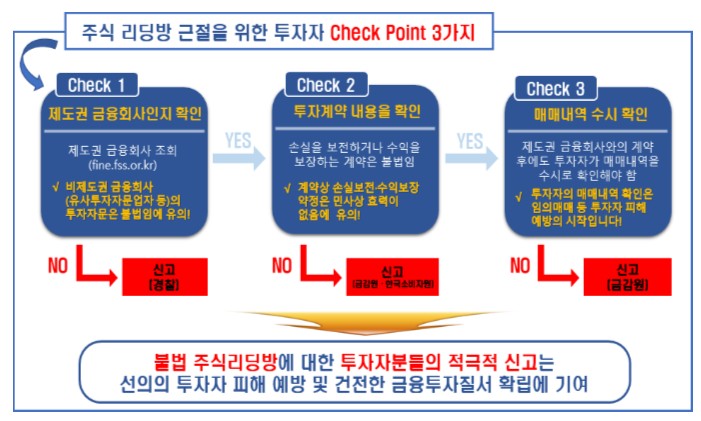 이러한 주식 리딩방은 대부분 주식 투자에 무지한 초보자들을 현혹하여, 불법적으로 이득을 취하고 투자자는 손해를 보는 데에 문제가 있습니다. 게다가 대부분의 주식 리딩방은 자본시장법상 불법이기에 구제를 받을 수 있는 방법도 없습니다. 이에 금융감독원은 투자자 피해를 예방하기 위해 체크 포인트 3가지 확인절차 안내 등 소비자 경보를 발령하였습니다.