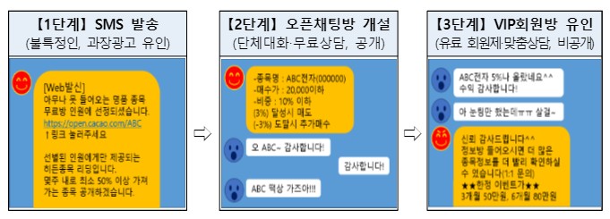 이 주식 리딩방은 대개 아래와 같이 불특정 다수에게 광고 메시지를 보내고, 오픈 채팅방을 개설, 이 곳에서 활동하는 사람들을 대상으로 다시 VIP 회원을 모집하는 형태로 일정 금액을 받아 운영됩니다.