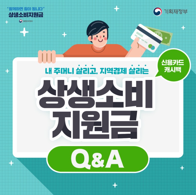 「상생소비지원금」 이란? 지역경제 활성화와 소비회복 촉진을 위해 신용 또는 체크카드를 2분기 월평균 사용액보다 3% 많이 쓰면, 3%를 넘는 증가분의 10%를 1인당 월 10만원까지 현금성 충전금으