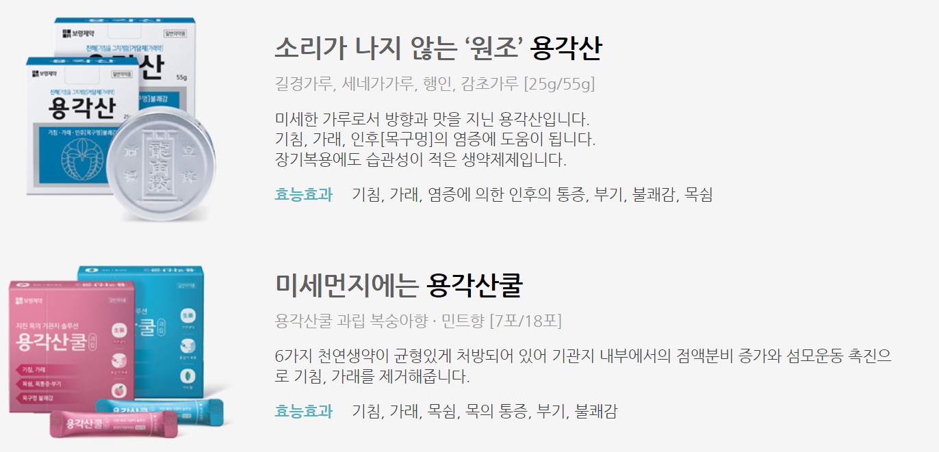 인후통의 특징은 그간 경험해본 것과는 달리 묵직하다기 보다는 다소 날카로운 느낌이랄까요. 찌르는 듯한 느낌이 강합니다. 누군가 용각산이 좋다고 해서 용각산을 사두었고, 뿌리는 인후통 치료제인 '목앤' 을 뿌리고 있습니다. 크게 나아진다기 보다는 잠시나마 괜찮아지는 것 같은 느낌이 듭니다. 아래를 보니 원조 용각산을 구매할 걸 하는 생각이 드네요. 저는 용각산 쿨을 구매했는데 ㅎㅎ 염증에 의한 인후의 통증이라면 원조 용각산을 구매하시는 것이 더 나을 것 같습니다. (절대 광고는 아닙니다 ㅋ)