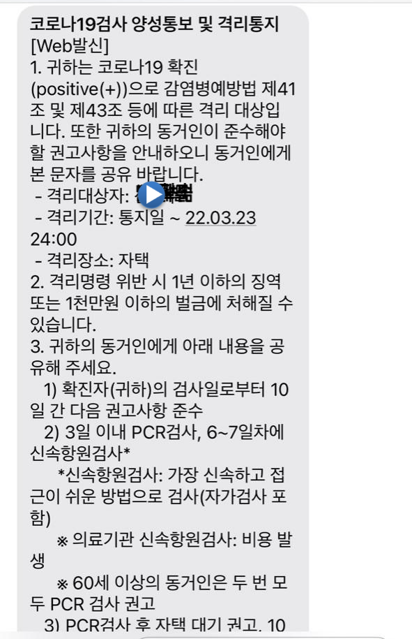 이미 증상이 있는 것 같아서 이렇게 된거 걸리고 넘어가자, 라는 생각을 했었는데, 당황스러웠습니다. 다시 또 찌르러 가야하다니;;;; 어쨌든 다시 보건소로 방문하여 미결정이라고 된 문자를 보여주고 재검사를 받았습니다. 오늘 아침에 받은 결과는 '확진'이었습니다. 증상이 있긴 하지만 그렇게 심하지 않아 또 다시 미결정 통보가 나오면 어쩌나 우려했는데, 다행히(?) 확진 통보가 나왔습니다.