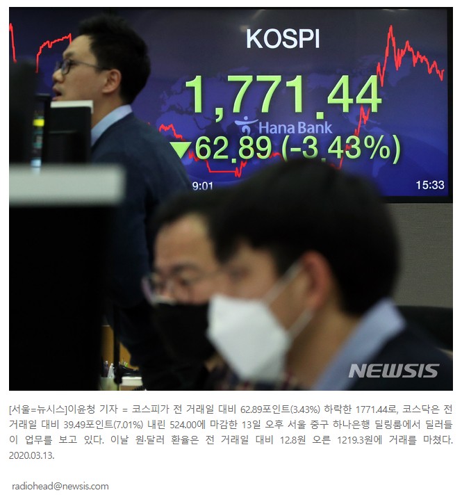 전세계 코로나19 사태가 3개월이 되어간다. 이번주엔 미국증시가 대폭락장이 되더니, 한국 주식 시장도 여지 없이 이에 반응 13일의 금요일인 오늘 지수는 5.23% 급락, 1808.56 포인트를 기록 1800선 붕괴 위기에 놓이기도 했고, 추가로 5% 이상 급락 8년 5개월만에 사이드카가 발동 되었다. 결국 1771.44 포인트에 장이 마감되었다.